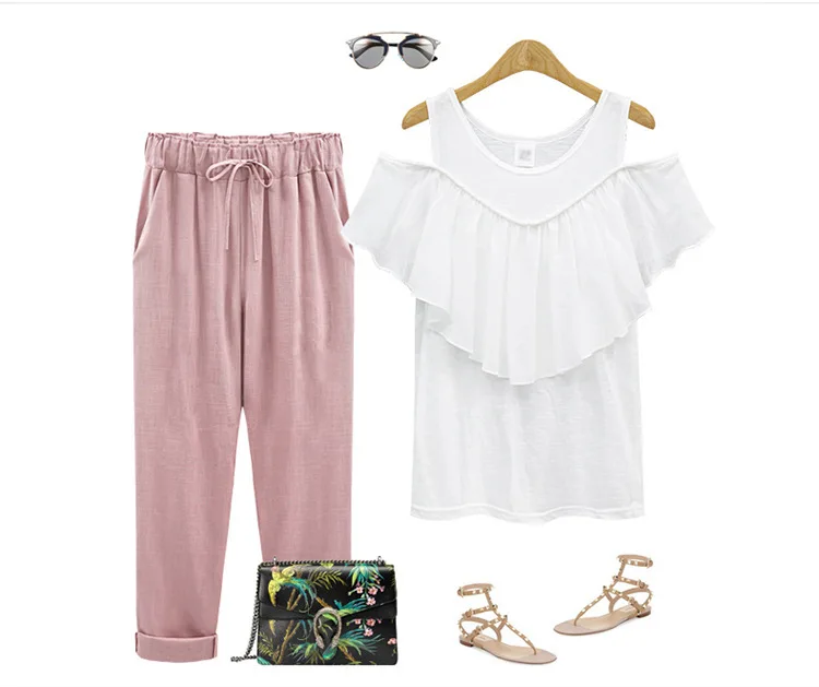 Хлопковые льняные брюки, эластичные, длиной до щиколотки, свободные...