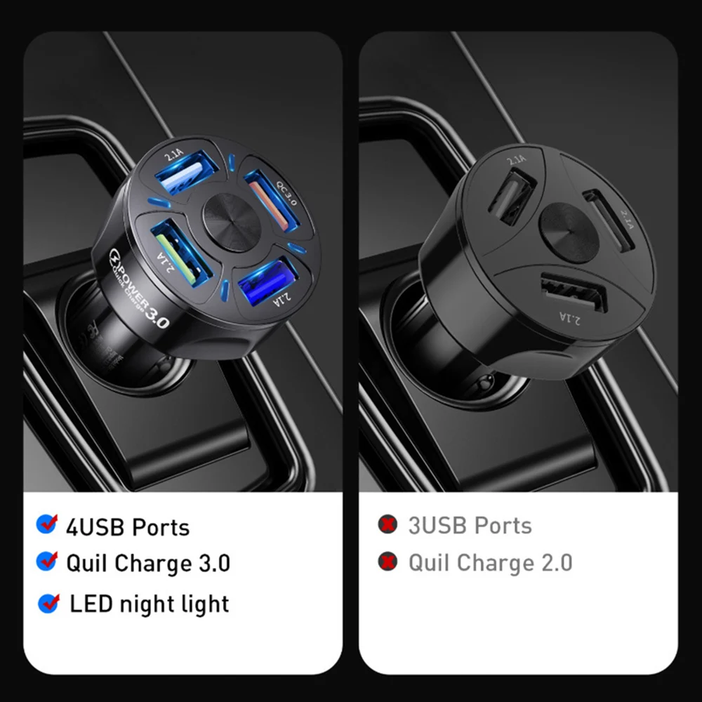 Автомобильное зарядное устройство с 4 USB-портами, QC 3,0, быстрая зарядка, светодиодный ночник, автомобильное зарядное устройство для iPhone, Xiaomi, Samsung, зарядное устройство для телефона в семейном автомобиле