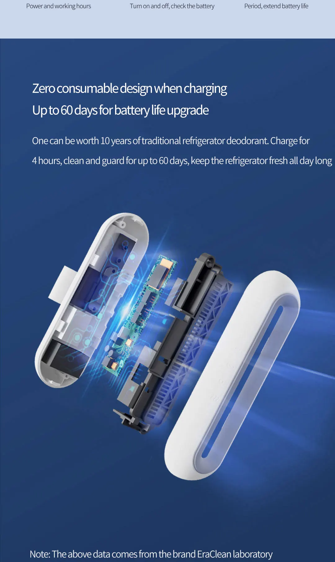 Режим свежести, дезодорирования и дезинфекции-Срок службы батареи (полная зарядка около 4 часов) ① около 72 часов для глубокого дезодорирования режим дезинфекции ② около 60 дней для свежести, дезодорирования и дезинфекции