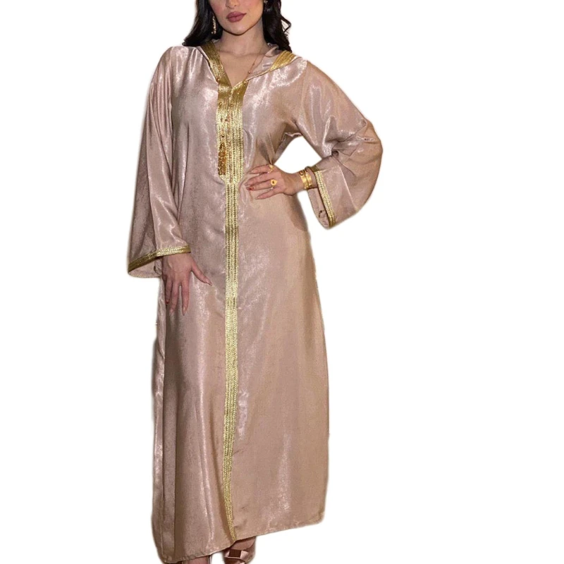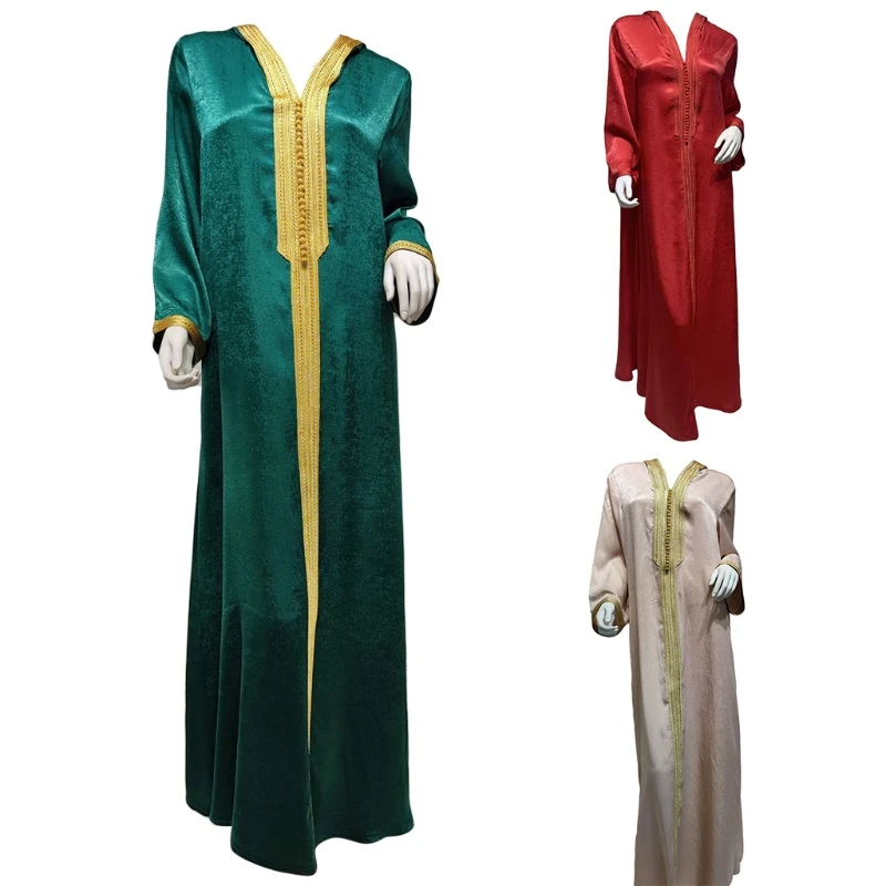 Дубай арабское мусульманское Макси платье для женщин с длинным рукавом бархатный халат с капюшоном Вышивка отделка марокканский кафтан Исламская одежда однотонная