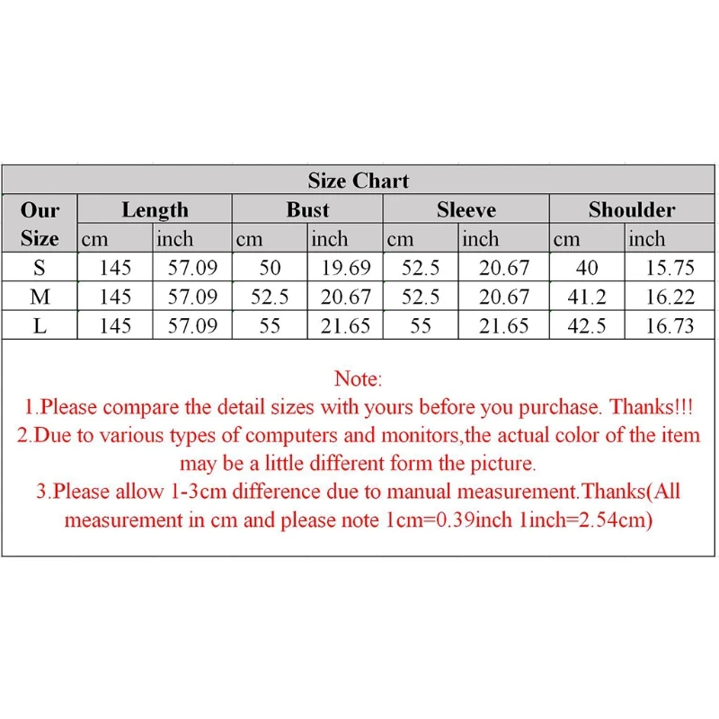 Материал: полиэстерЦвет: Шампань, зеленый, красныйРазмер: S/M/L (китайский размер, следуйте таблице размеров, чтобы выбрать, пожалуйста)Размер: S Длина: 145 см (57,08 дюйма) бюст: 50 см (19,68 дюйма) рукав: 52,5 см (20,66 дюйма) плечо: 40 см (15,74 дюйма)Размер: M Длина: 145 см (57,08 дюйма) бюст: 52,5 см (20,66 дюйма) рукав: 52,5 см (20,66 дюйма) плечо: 41,2 см (16,22 дюйма)Размер: L Длина: 145 см (57,08 дюйма) бюст: 55 см (21,65 дюйма) рукав: 55 см (21,65 дюйма) плечо: 42,5 см (16,73 дюйма)Количество: 1 шт.Теплая подсказка: