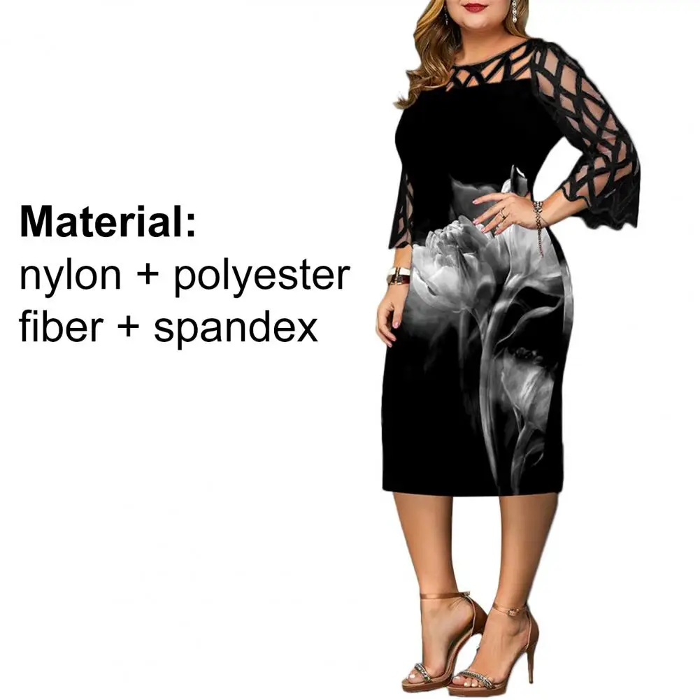 2021 женское платье до колена с круглым вырезом и рукавами 3/4, Сетчатое облегающее платье с цветочным принтом в стиле пэчворк для вечерних платьев размера плюс
