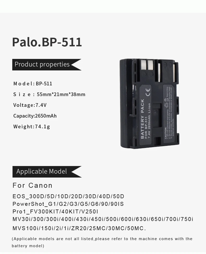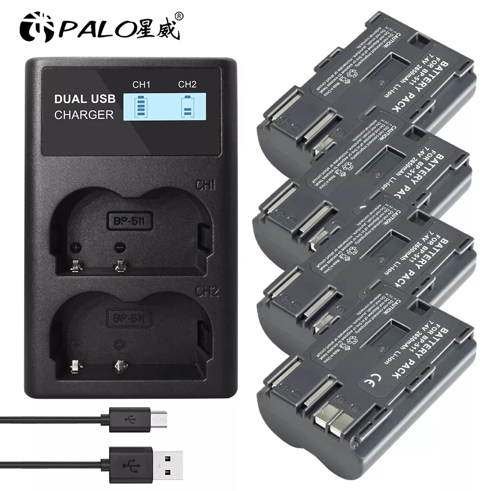 Аккумулятор PALO BP-511-B, 7,4 В, 2650 мА ч, BP-511, BP 511, 511, BP511, BP511A, зарядное устройство USB с ЖК-дисплеем для камеры Canon EOS 40D, 300D, 5D, 20D, 30D, 50D