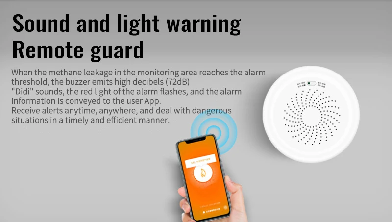 【Звуковой сигнал и светильник】При обнаружении, что концентрация природного газа в воздухе достигает стандарта, детектор издаст сигнал до 72 децибел и издаст красный светильник, мигающий сигнал тревоги, И отправьте сигнал тревоги на хост, и сообщите информацию на мобильный телефон пользователя.