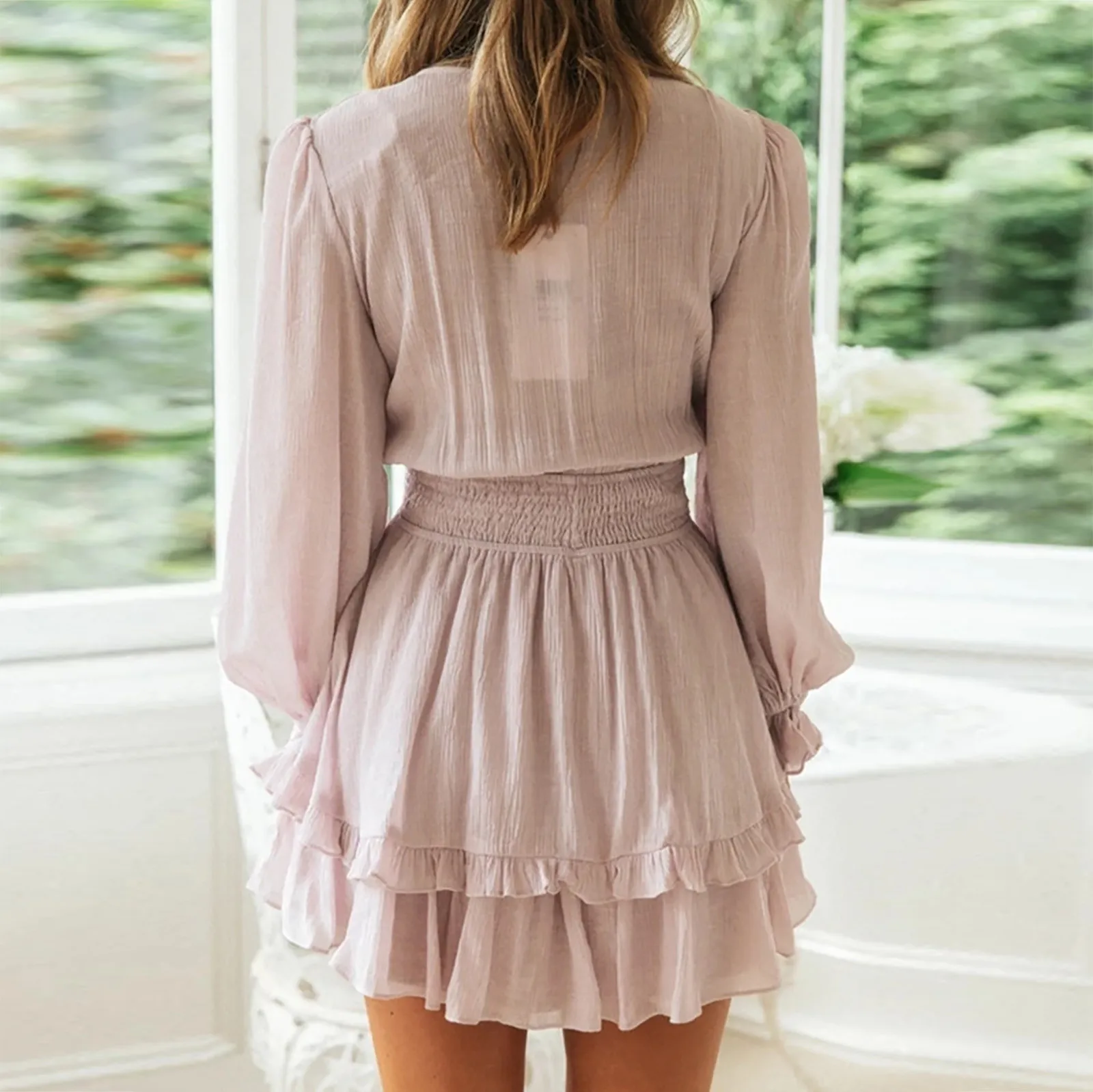 Женское однотонное платье с V-образным вырезом и длинным рукавом