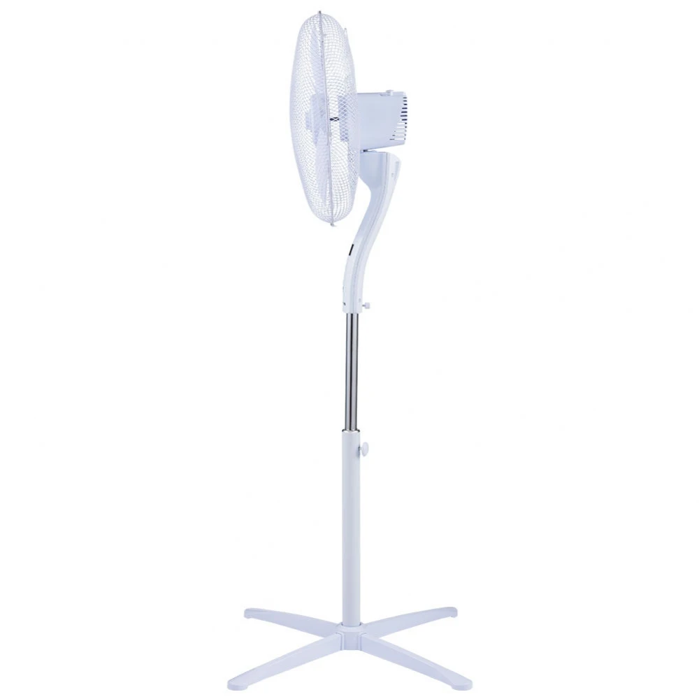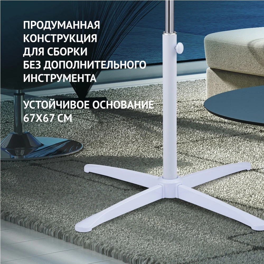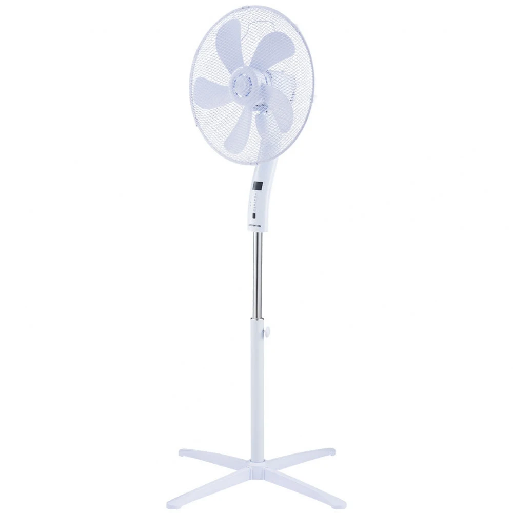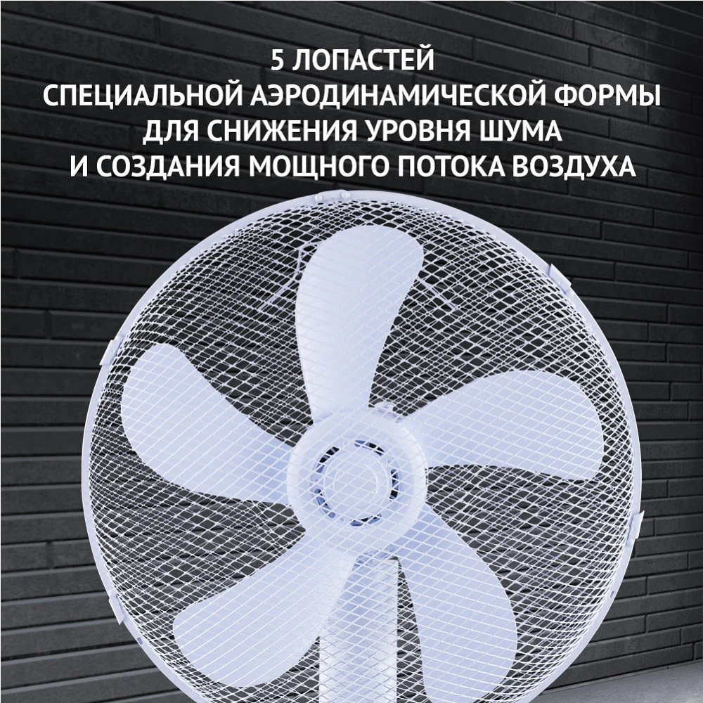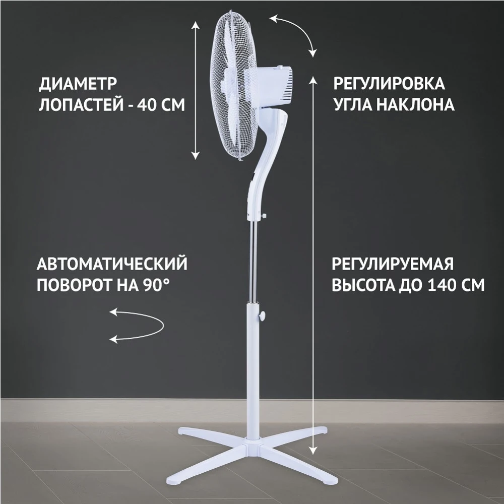 Современный дизайн в классическом белом корпусе. Продуманная конструкция для сборки без дополнительного инструмента. 5 лопастей специальной аэродинамической формы для снижения уровня шума и создания мощного потока воздуха. 3 режима работы. 3 дополнительных режима: Night, Sea Breeze, Natural Wind. 3 скорости воздушного потока. Увеличенный LED-дисплей. Встроенный термометр. Таймер на 9 часов. Пульт дистанционного управления. Работа в стационарном положении и с автоматическим поворотом на 90⁰. Ступенчатая регулировка угла наклона. Устойчивое основание 67*67 см. Регулировка высоты. Высота: 140 см. Мощность: 55 Вт.