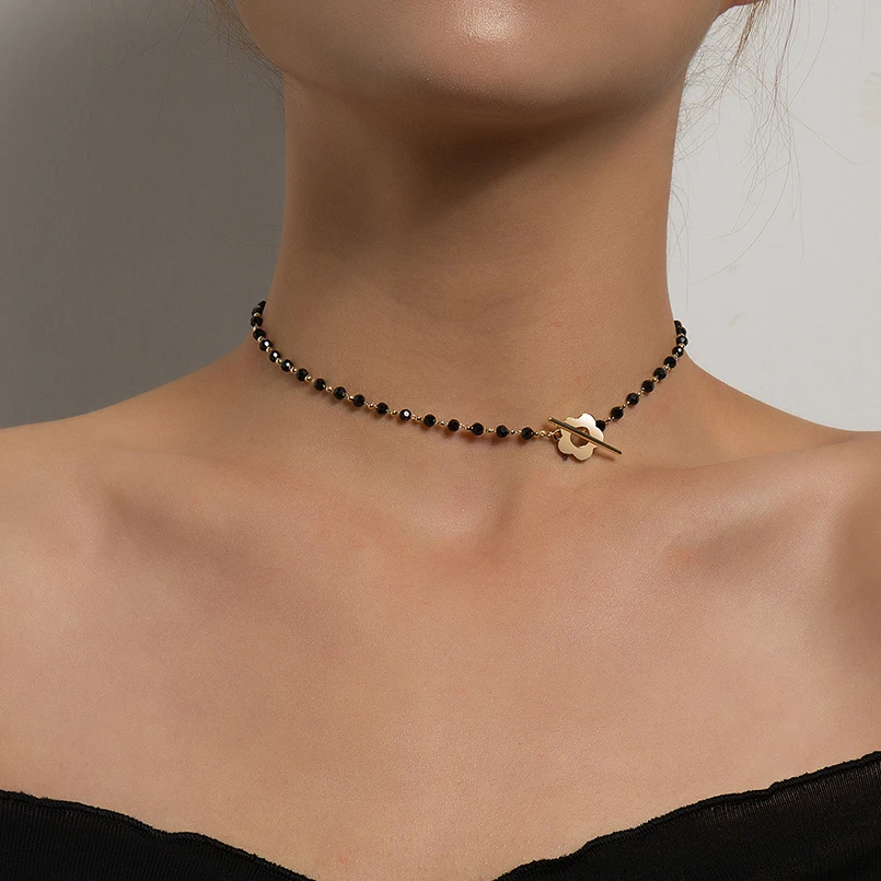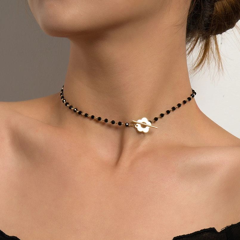 Модное черное ожерелье до ключицы с бусинами из кристаллов простая Пряжка короткое ожерелье с цветком для женщин богемное женское ювелирное изделие