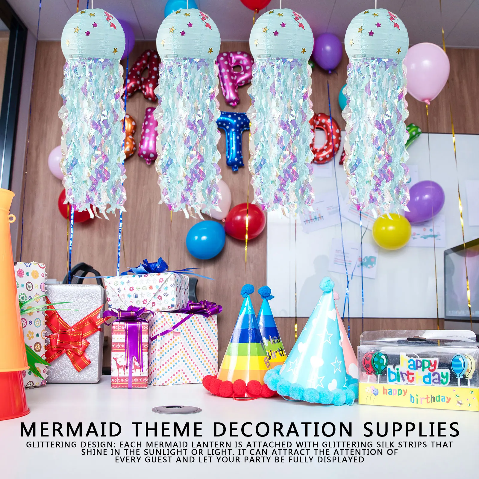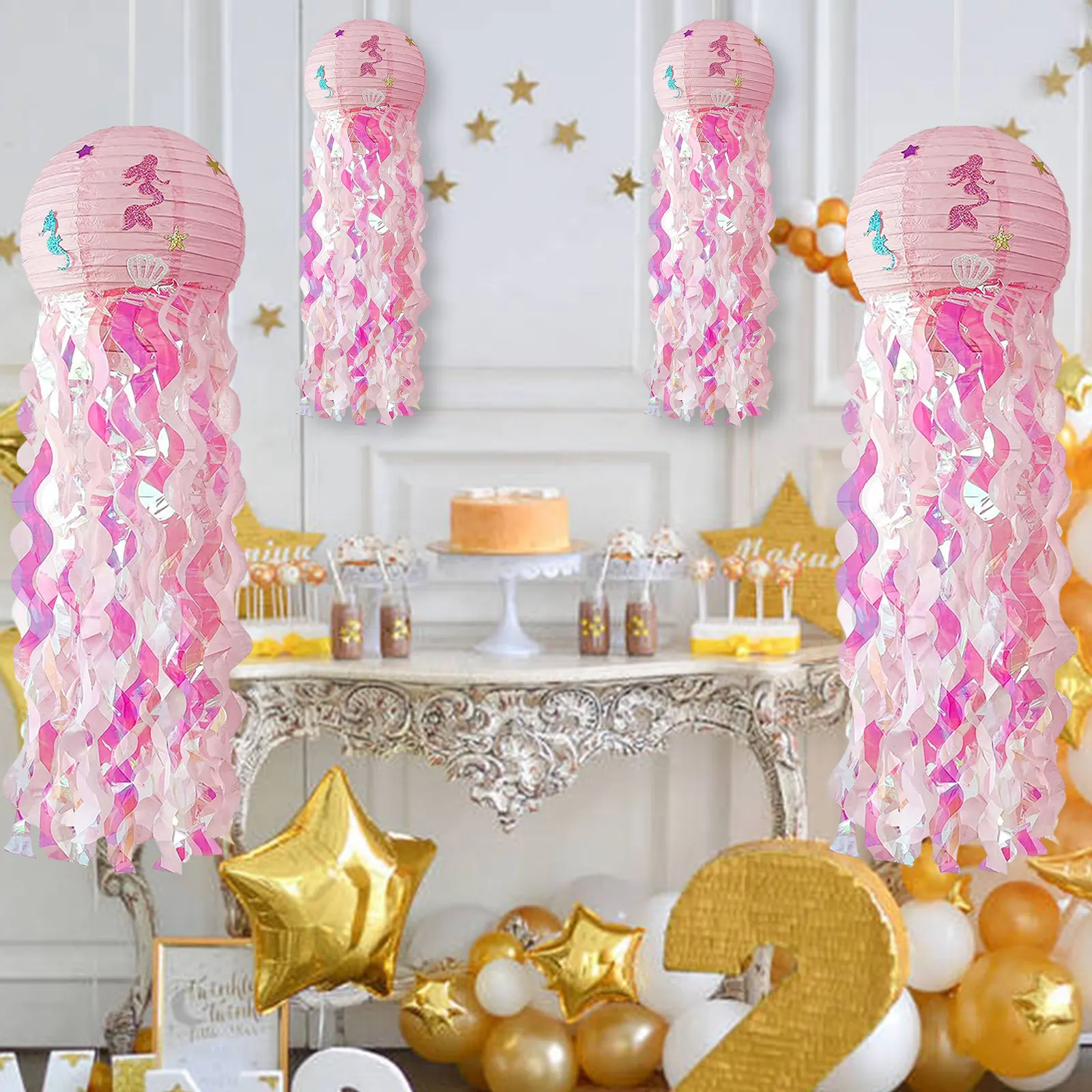 Блестящий дизайн: каждый фонарь русалки прикреплен блестящими шелковыми полосками, которые блестят на солнце или светильник. Это может привлечь внимание каждого гостя и полностью отобразить ваши вечерние часы.