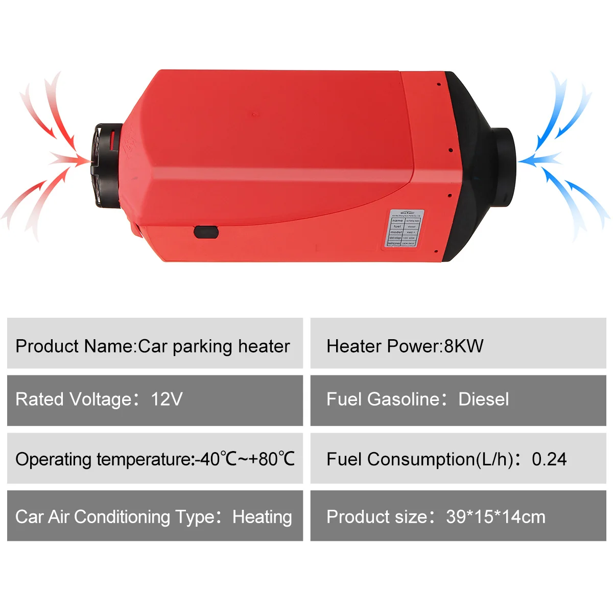Название: 12V 8kW Дизельный подогреватель воздуха комплектХарактеристики:Материал: металл + пластикЦвет: красныйРазмер: 390x150x140 мм (15x6x5,5 ")Напряжение: 12 ВМощность: 8000 ВтТопливо: ДизельПолный коэффициент сгорания: 100%Расход топлива: 0,1 ~ 0,24 лРабочая температура: -40 °C ~ 80 °C