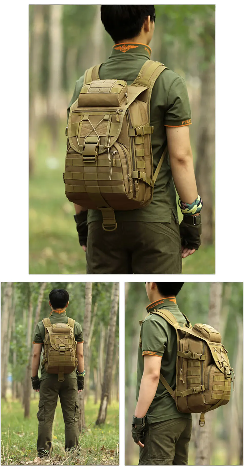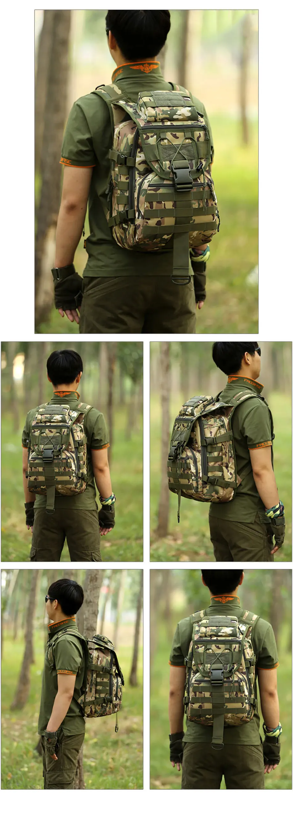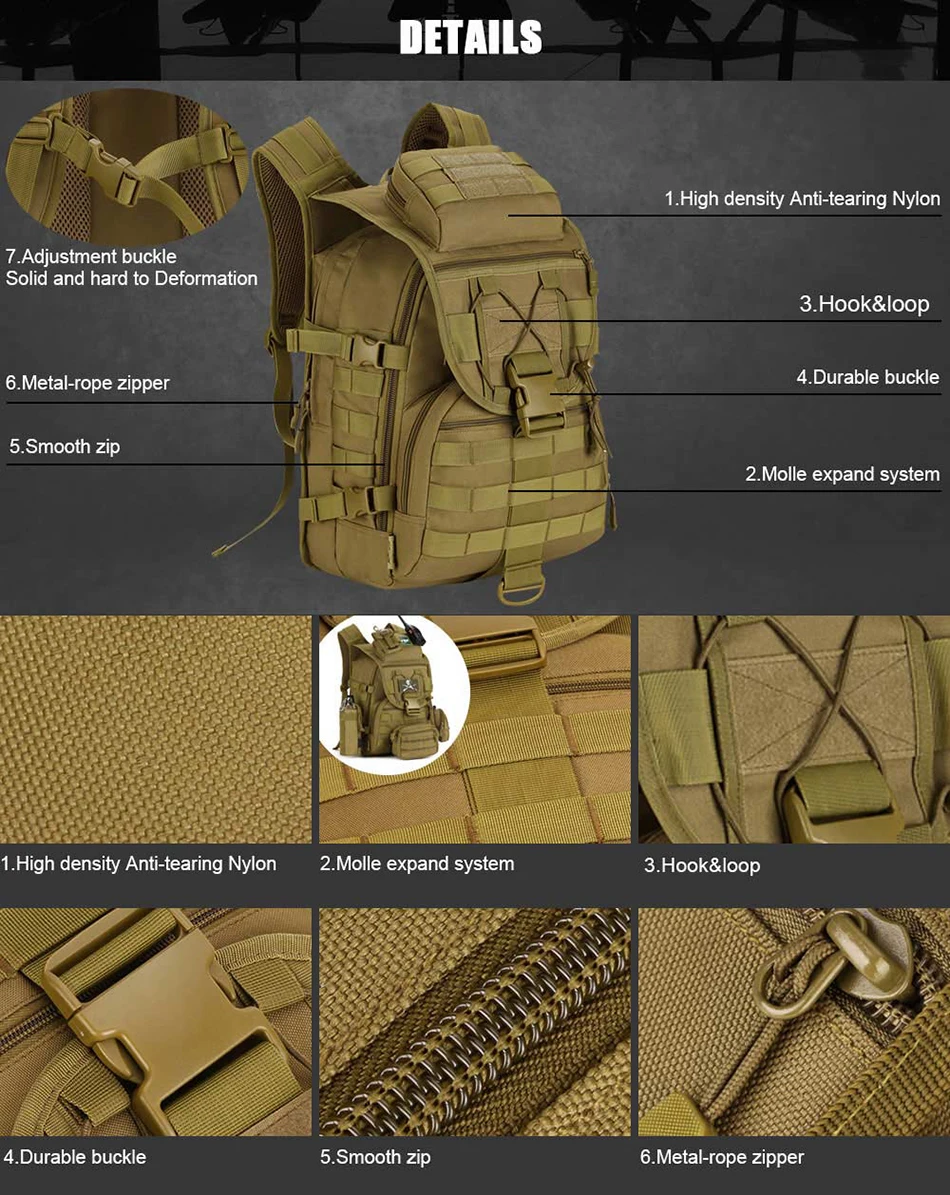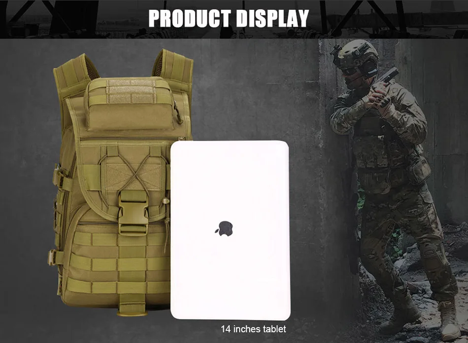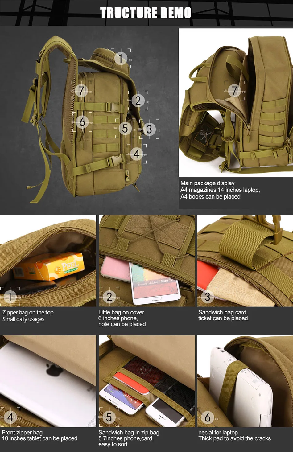 Особенности:Изготовлен из ткани Оксфорд высокой плотности 600D, устойчив к разрыву, истиранию и водоотталкиванию и легко реагирует на различные суровые условия.Эргономичный дизайн с отрицательной кривизной и пригодностью человека для эффективного снятия давления на плечоБольшой емкости загрузки пространства, несколько отсеков для легкого отдыха на открытом воздухеНесколько систем Крепления MOLLE в корпусе, модульный дополнительный Подшипник нагрузки, может использоваться для фиксации чайника, подвесных украшений и т. д. на модульной системеДвусторонняя молния удобна для левого и правого использования в процессе переноски, что отражает гуманизированный дизайн.Расширительная система Velcro, может использоваться для прикрепления к различным индивидуальным наклейкамРегулируемые плечевые ремни и нагрудные ремни, чтобы удовлетворить ваши потребности и удовлетворить ваш комфортПодходит для занятий спортом на открытом воздухе, таких как бег, альпинизм, скалолазание, охота, Велоспорт, кемпинг, туризм, туризм и т. д.