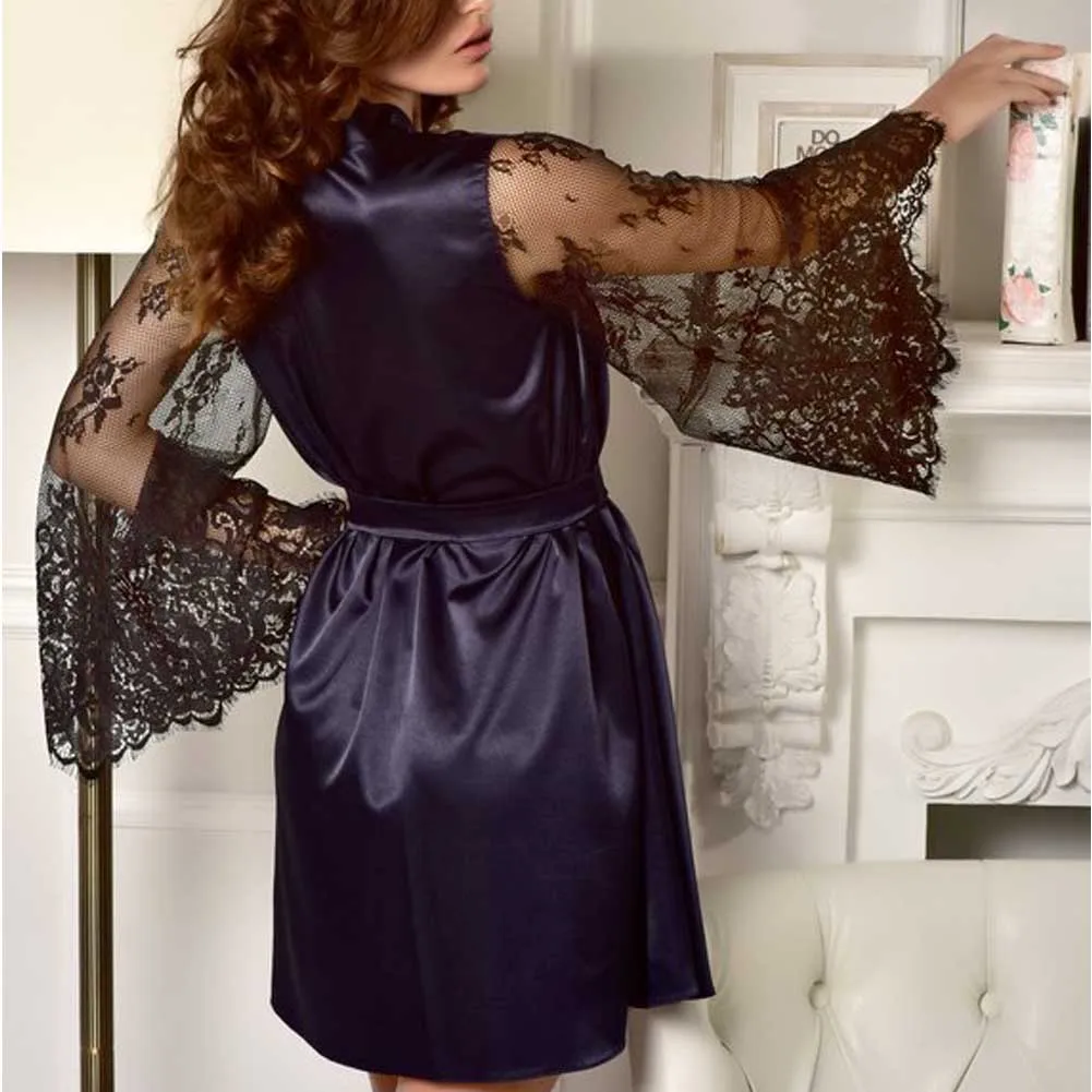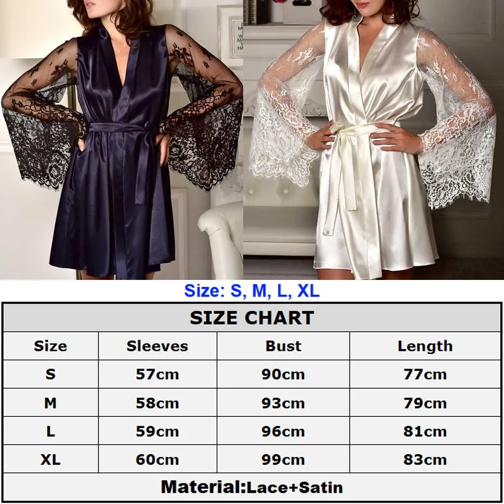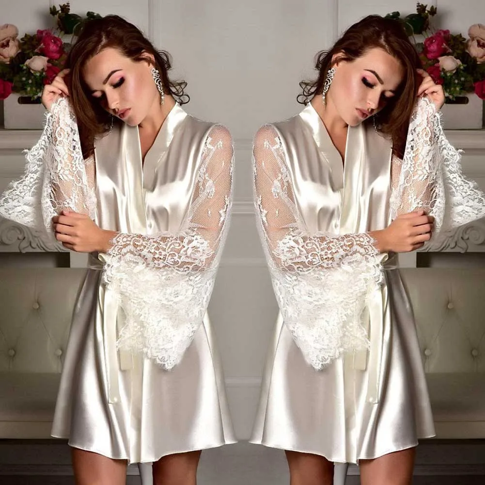 Женская ночная рубашка, со съемным поясом, с длинным прозрачным рукавом, кружевное, атласное