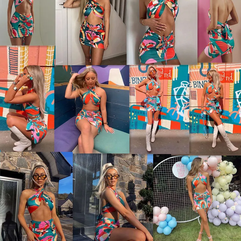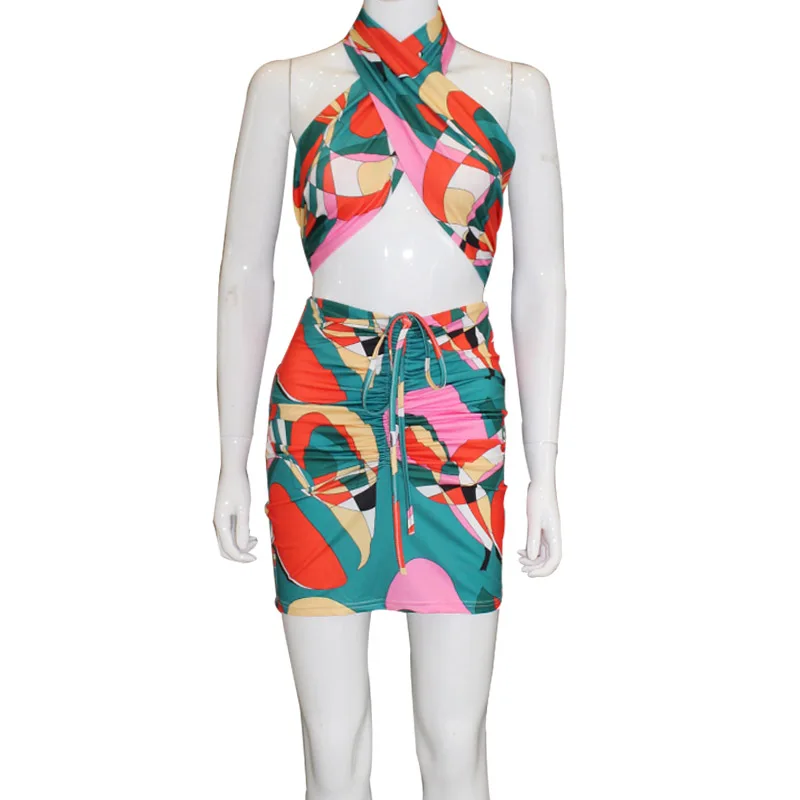 Женский спортивный костюм с принтом, повседневный комплект из 2 предметов, топ с лямкой на шее и мини-юбка с рюшами на завязках