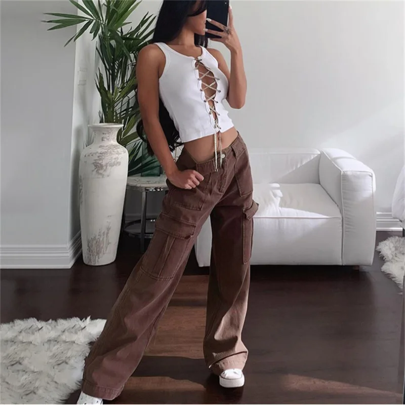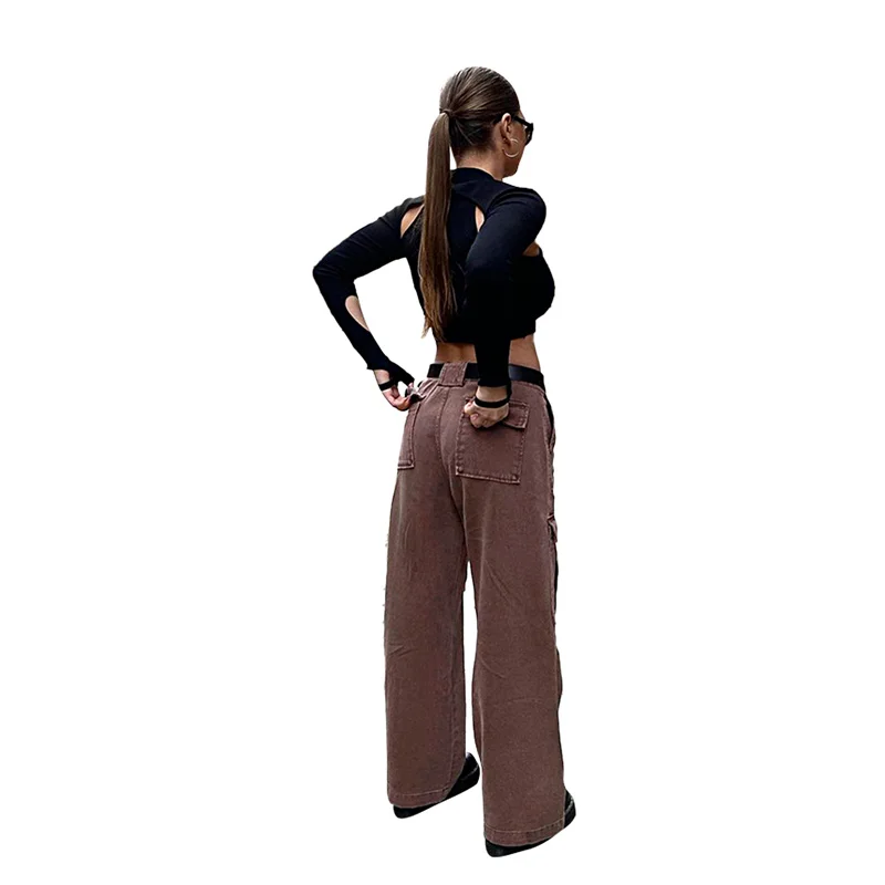 Женские джинсовые брюки с широкими штанинами, однотонные брюки составного кроя с карманами и высокой талией в Корейском стиле, уличная одежда, 2021