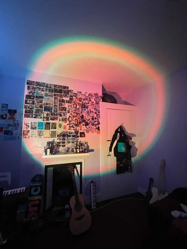 I just cant stop staring at the beckoning glow! The mellow orb from this Sunset Lamp on my once dark bedroom wall captivates my soul and warms my spirit. At first I thought I would just leave it on the yellow sunset mode, but I have also grown to love the Fade mode between all of the many colors. The colors are not too intense, but strong enough to let you know the light is there with you. In a room already filled with daylight, you may not notice this light, but once evening sets in, this lamp will make the room blossom with color, gently flooding both the room and ones soul. The remote makes it easy to change the color or mode without getting up, and the head of the lamp swivels and pivots to allow the glowing orb to be easily directed to the ceiling, wall, or even the floor. If you want happiness, you want this sunset lamp in your life!