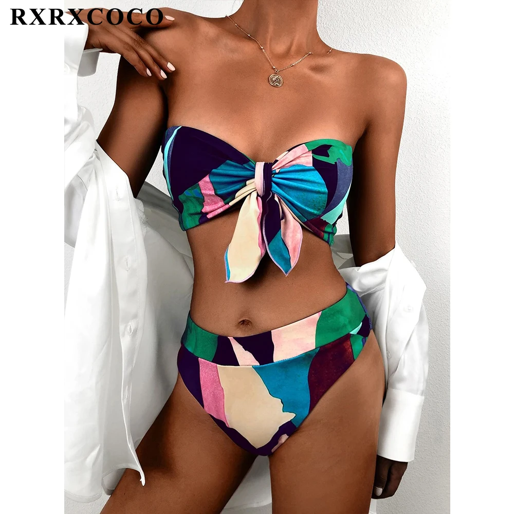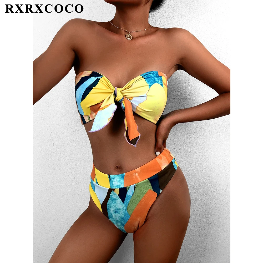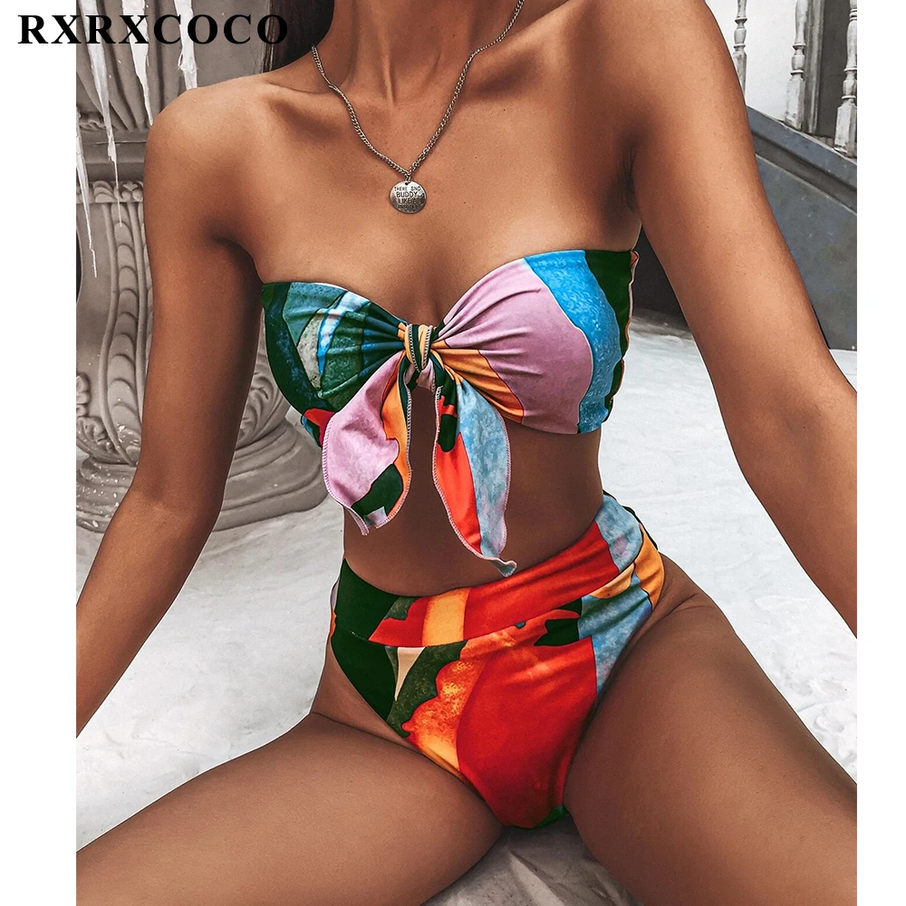 RXRXCOCO печатных бандо, женское бикини 2021 Высокая Талия бикини, набор, пуш-ап, купальник Юбка-брюки для девочек, многослойная юбка-пачка Одноцветный Купальник для женщин