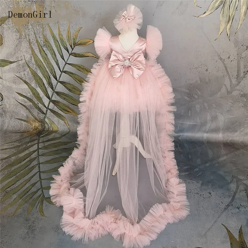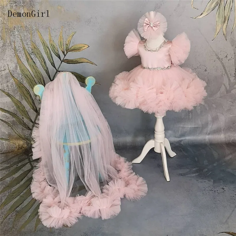 Пышное розовое Цветочное платье для девочек, детское платье из органзы с бисером для свадебной вечеринки, милое бальное платье, платья принцессы на день рождения с длинным шлейфом