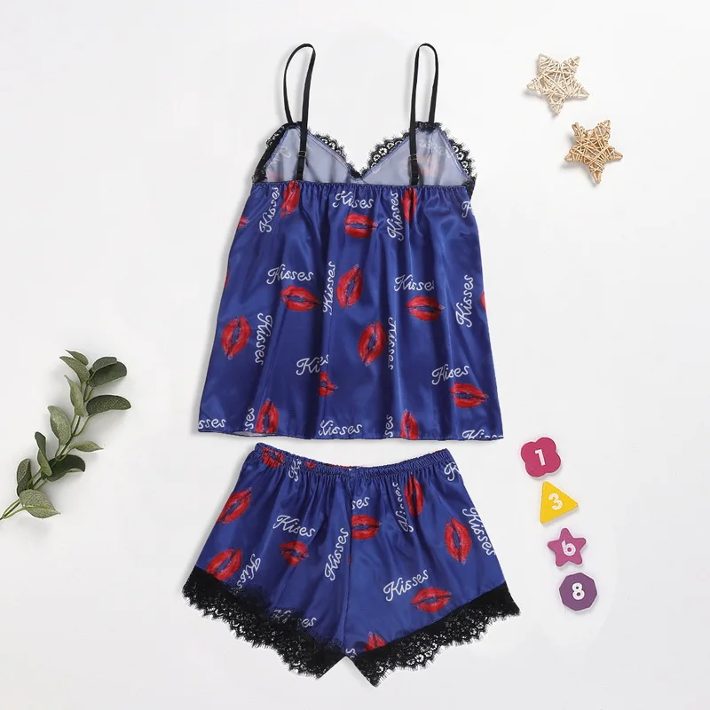 2021 Пижама с кружевами и принтом с губами, женские пижамы наборы v-образным вырезом стрейч Атлас, сексуальное нижнее белье, одежда для сна, Пижама домашняя одежда ночная одежда