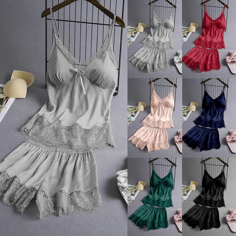 Пижама женская шелк кружево сатин с V-образным вырезом, пижама с ба...