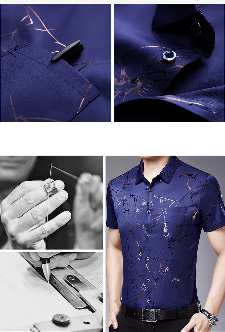 Рубашка мужская приталенная с принтом, шелковая Хлопковая сорочка с короткими рукавами, повседневная одежда, C779, лето