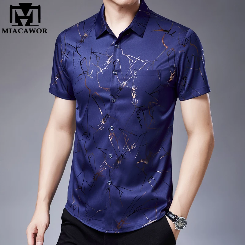 Рубашка мужская с коротким рукавом, шелк, Повседневная приталенная,...