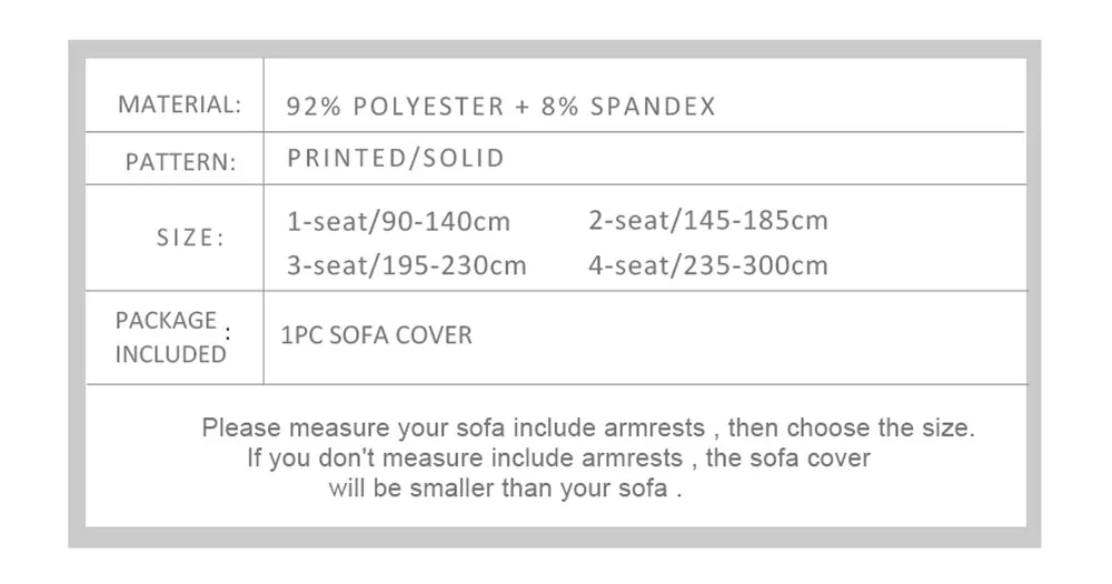 Пожалуйста, измерьте свой диван с подлокотником, затем выберите размер, если вы не измерите его, крышка дивана будет меньше, чем ваш диван.