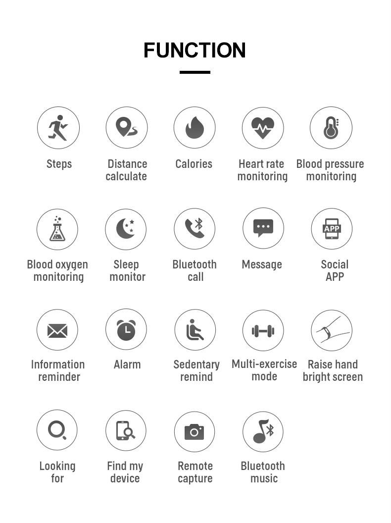 Теплое напоминание: заряжайте часы перед использованием, это занимает много времени для транспортировки, и батарея измотана!Описание:-- Модель ремешка: 42 мм u-образный силиконовый ремешок с пряжкой-Метод зарядки: Беспроводная адсорбционная зарядка (зарядка ниже 1 а)-Основной чип: HS6620 + BK3266 (чип функции вызова Bluetooth)-Размер памяти: 32 м/32 м-- G-сенсор: Поддержка-Спецификация дисплея: 1,54 "квадратный цветной экран-- Разрешение: 320*320-Режим кнопки: Мульти-сенсорный экран + кнопка ручки/обычная кнопка переключенияИ функциональные кнопки-Аккумулятор: 160 мАч полимерный аккумулятор-Энергопотребление в режиме ожидания: режим ожидания в течение 5 дней, нормальное использование 3-4 дней (в зависимости от способа использования и частоты использования пользователя)-Тип Bluetooth: Bluetooth 5,0-- Мобильный телефон Системные требования: IOS 9,0 и выше, Android 5,0 и выше-Напоминание о сообщениях в социальных приложениях: Поддержка программного обеспечения связи, таких как Facebook, Twitter, Line, Whatsapp, Instagram.Характеристика:-Счетчик шагов-Расстояние-Калории-Пульс/кровяное давление-Вызов по Bluetooth-Музыка Bluetooth-Мониторинг сна-Входящий вызов-Sms-уведомления-Напоминание о сообщении в социальных приложениях-Напоминание о тревоге-Напоминание о малоподвижности-Больше спорта-Запястье поворачивается на яркий экран-Ищу браслет-Найдите мобильный телефон-Удаленное фото-Не беспокоить режим-Пользовательский циферблатЯзык:Язык интерфейса: упрощенный китайский, английский, французский, испанский, португальский, русский, немецкий,Язык приложения: Поддержка английского, упрощенный китайский, традиционный китайский, голландский, русский, французский, немецкий, португальский, испанский, турецкий, японский, польский, арабский, Малайзийский, тайский, чешский, словацкий,Упаковочный лист:Подарочная коробка * 1Умные часы * 1Магнитный зарядный кабель * 1Руководство на китайском и английском языках * 1