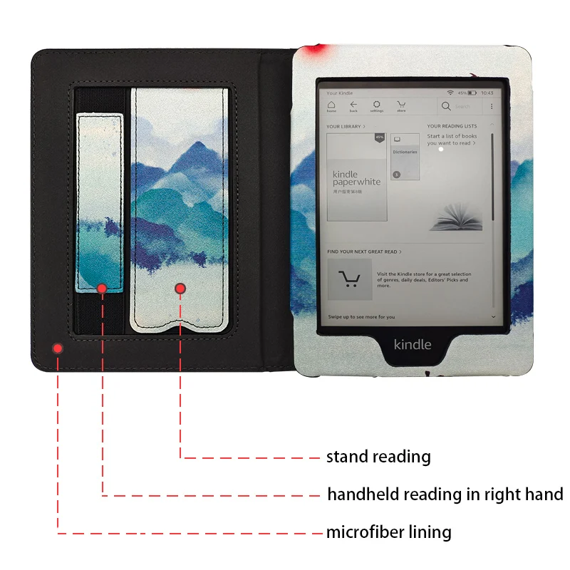 1. Точное положение отверстия, идеально подходит для спецификации продукта и места зарядки.2. Открывается как книга, автоматически пробуждая Kindle paperwhite, когда открывается и кладет его в Сон при закрытии.3. Тонкий и ультра легкий. Изготовлен из высококачественной противоскользящей искусственной кожи и с нескользящей микрофиброй.4. Интегрированный магнит сильно впитывает и надежно закрывает устройство и не беспокоится о случайном открытии.
