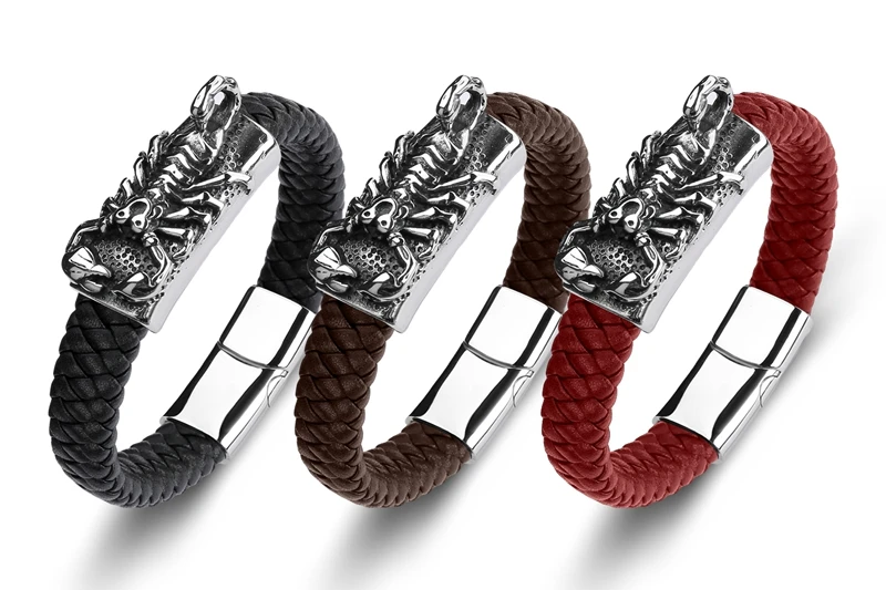 Новые модные кожаные браслеты со скелетом из нержавеющей стали, мно...
