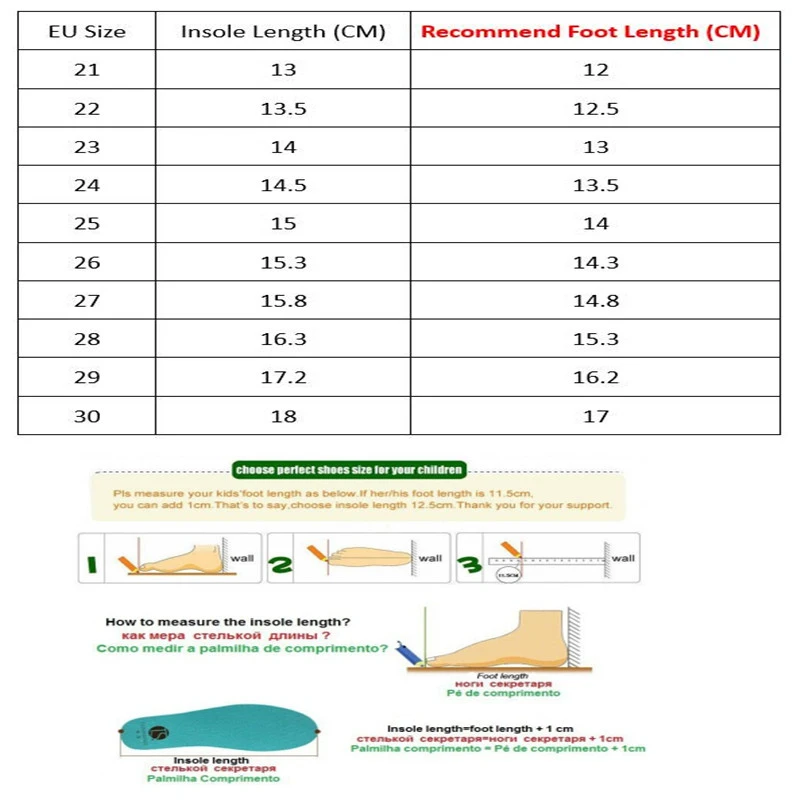 Как выбрать размер: длина стопы + 1 см = длина стельки обуви, если длина стопы 16 см, длина стопы + 1 см = длина стельки обуви, поэтому 16 см + 1 см = 17 см, вам нужно выбрать этот размер, длина стельки которого составляет около 17 см, вы можете выбрать размер CN 29