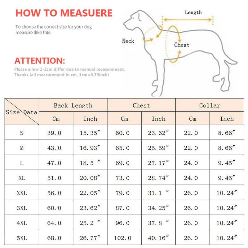 1. Перед заказом проверьте размеры вашего питомца, чтобы убедиться, что одежда подходит для домашних животных (1 дюйм = 2,54 см)