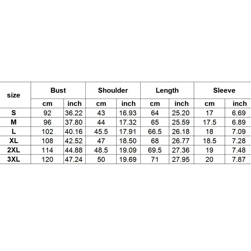 Размер Бюст Плечо Длина Рукав См Дюйм См Дюйм См Дюйм См Дюйм S 92 36,22 43 16,93 64 25,20 17 6,69 М 96 37,80 44 17,32 65 25,59 17,5 6,89 L 102 40,16 45,5 17,91 66,5 26,18 18 7,09 XL 108 42,52 47 18,50 68 26,77 18,5 7,28 2XL 114 44,88 48,5 19,09 69,5 27,36 19 7,48 3XL 120 47,24 50 19,69 71 27,95 20 7,87Посылка в комплекте: женская футболка * 1