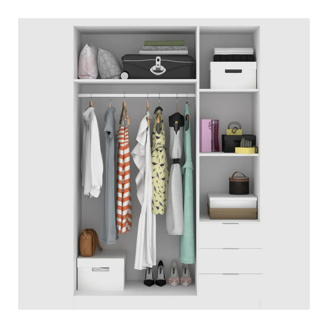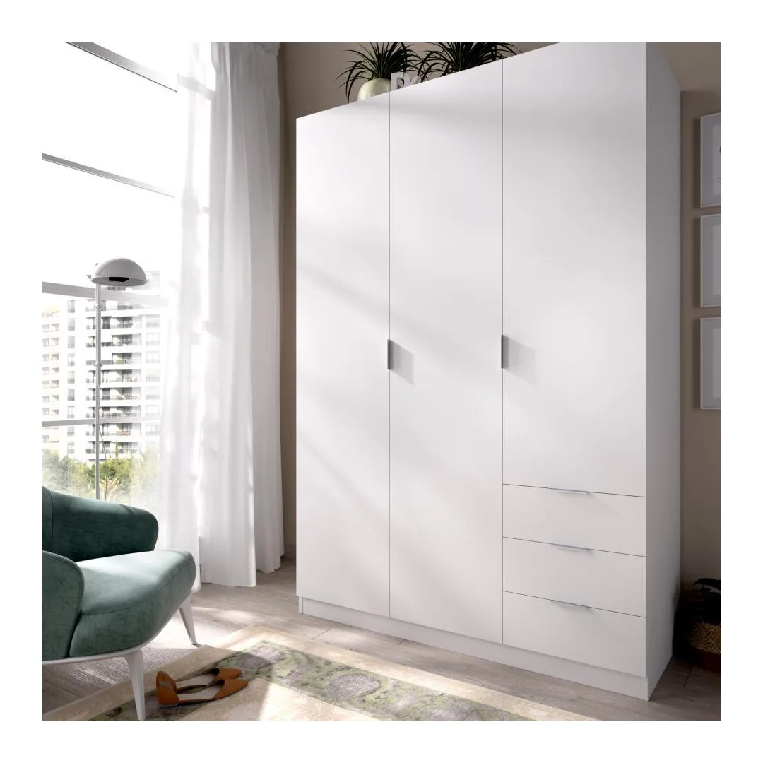 Three-door swing cabinet divided into two parts: one with one bar and one shelf, and one with two shelves and three outer drawers.