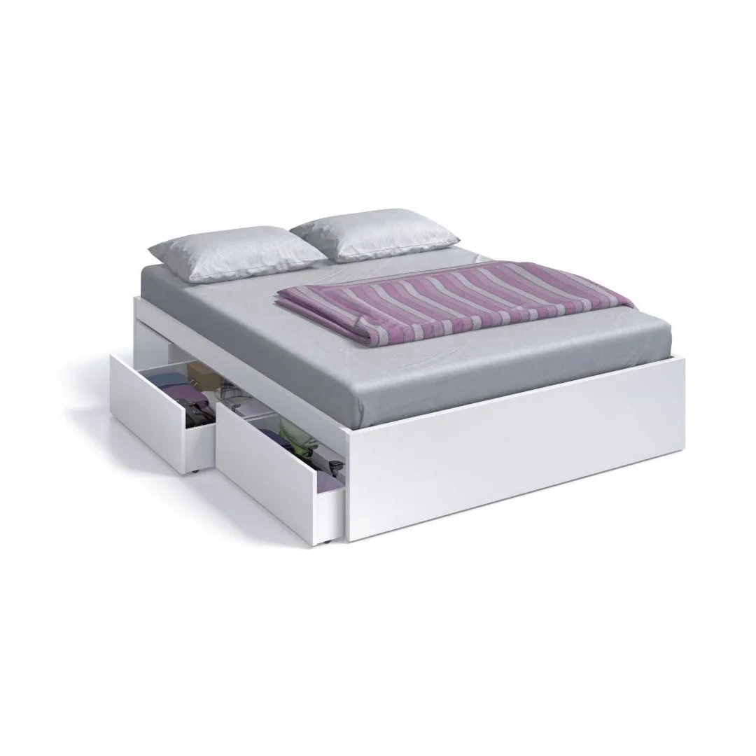 It is a handy double bed that features 4 large drawers at the bottom, to store all kinds of your bedroom's belongings: pillows, cushions, blankets or even seasonal clothing. All drawers are removable, open with a comfortable hidden wheel system and inside are white on all models. Each drawer can withstand a maximum weight of 5kg. The bed is made of high quality melamine, a synthetic and non-porous material, so it is ideal for a storage cabinet like this. Stylish Design, fits perfectly with many models of bedside tables and heads. It is a high-strength furniture, which in total supports a maximum weight of 180 kg. It is a bed compatible with a mattress and bedspread of 150x190 cm. The furniture does not include somier, mattress or pillows, But it does include 4 metal brackets for its stand and anti-noise and anti-scratch ABS studs on the bottom of the cabinet to avoid scratching the floor when moving the bed.