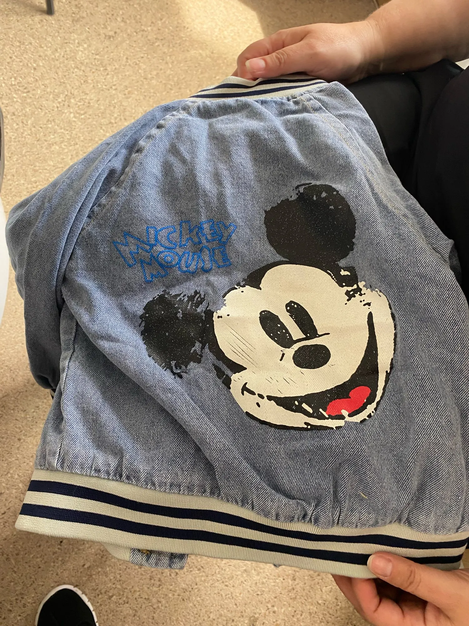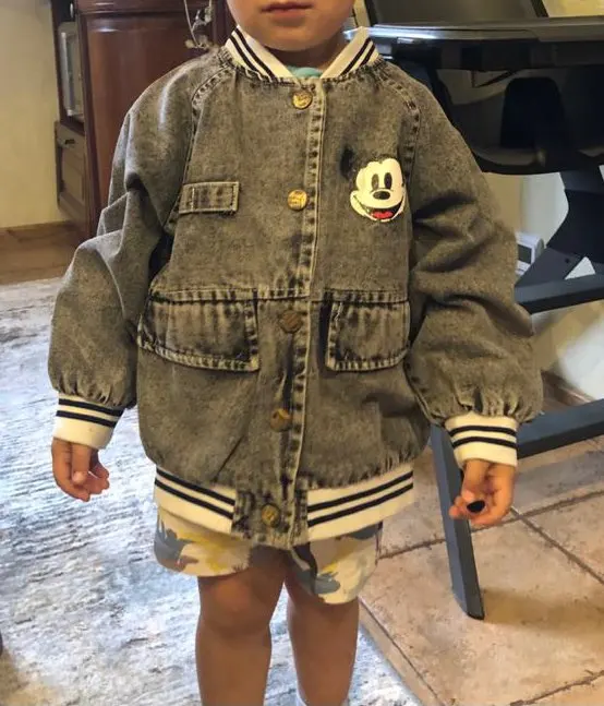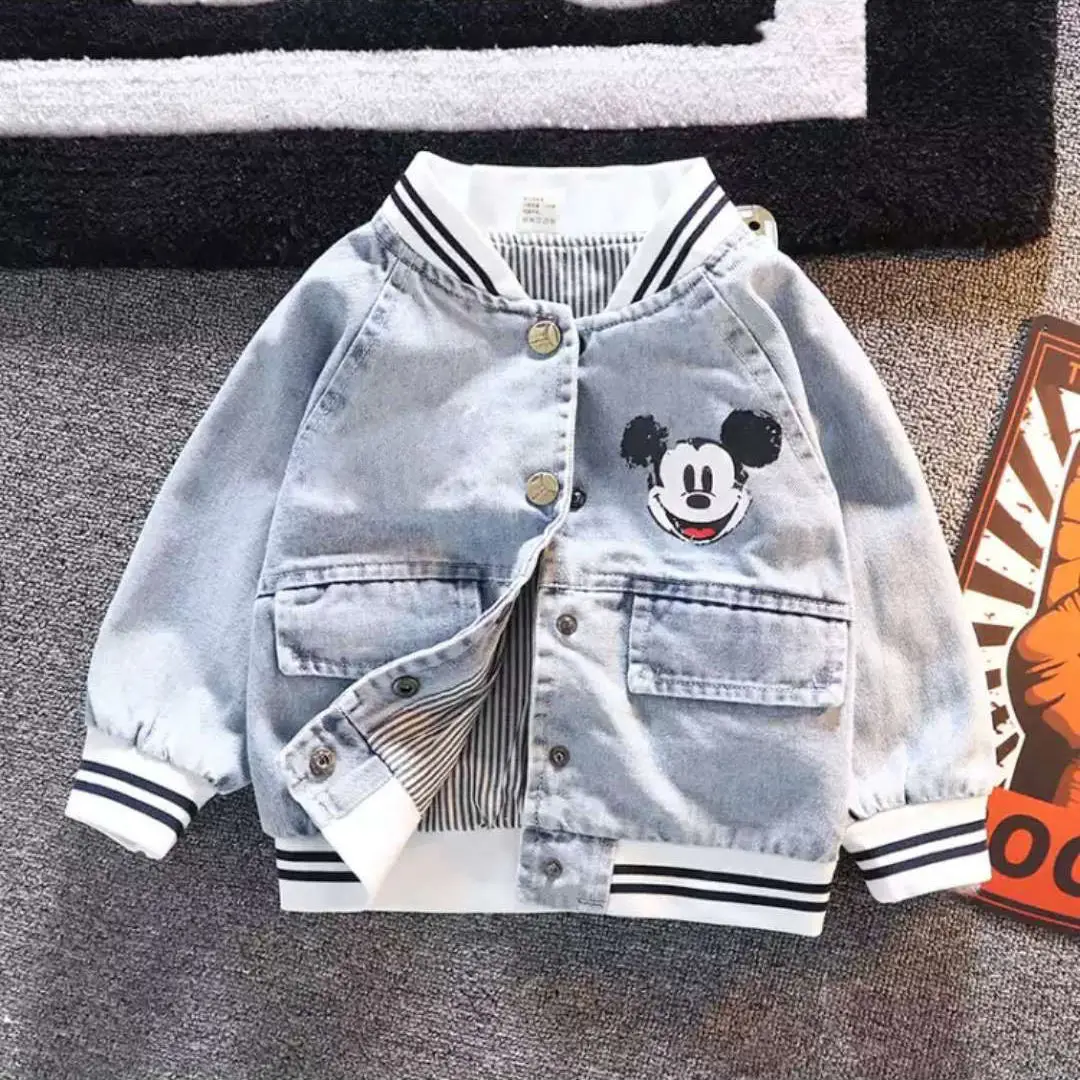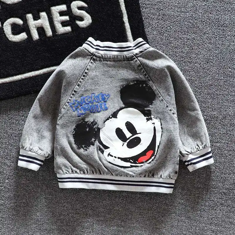 Осенняя джинсовая куртка для маленьких мальчиков с Микки Маусом, пальто, детская однобортная куртка с мультяшным рисунком и воротником-стойкой, верхняя одежда