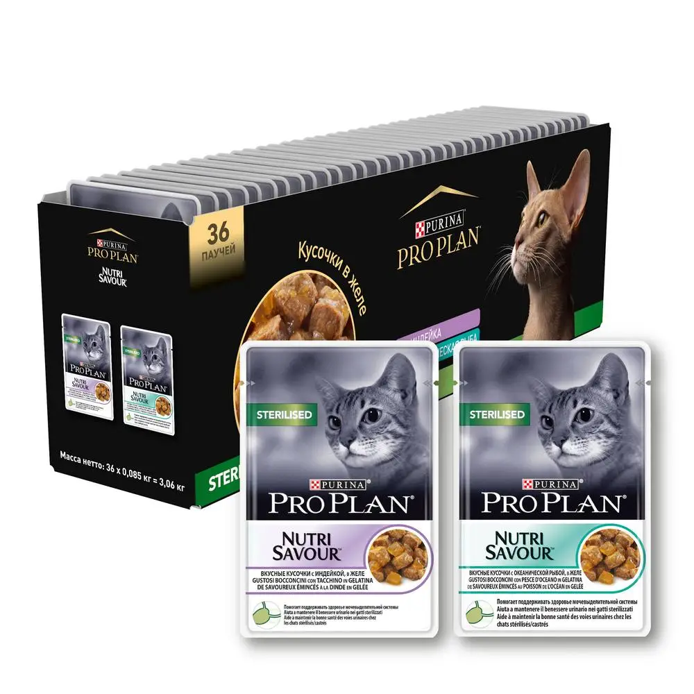 Мультипак Pro Plan Nutri Savour Sterilised для кошек 36х85 г: с индейкой в желе, 18шт; с океанической рыбой в желе, 18шт