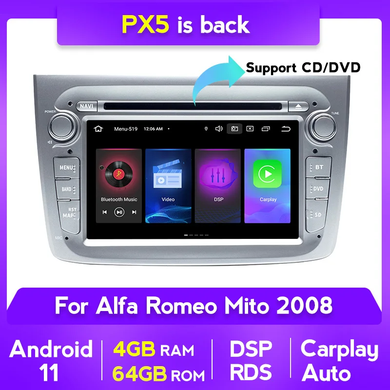 Carplay + Авто Android 11 автомобильный мультимедийный DVD-плеер для Alfa Romeo Mito 2008-2012 Радио Стерео GPS навигация RDS DSP WIFI BT SWC