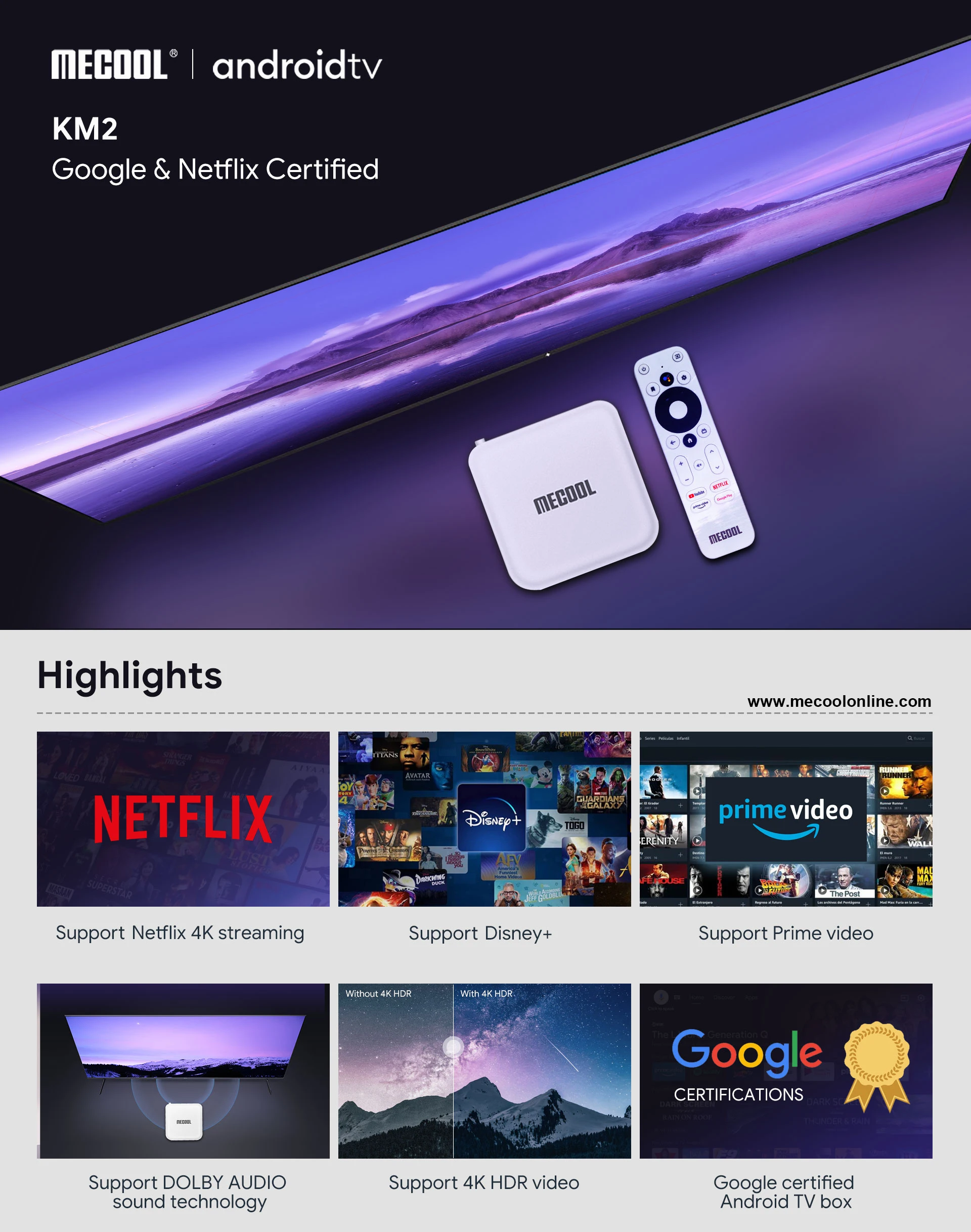 KM2-это ТВ-бокс с сертификатом Google и работает на ОС Android TV 10. Конечно, устройство поддерживает Google Assistant и встроенный Chromecast. Кроме того, имеет наиболее важные сертификаты ведущих поставщиков: Google, Netflix И PrimeVideo. KM2 потоковое устройство отображает до 4K @ 60fps потоковое содержимое также из других популярных потоковых услуг, таких как Disnay +, HBO и т. д. устройство поддерживает 4K HDR, HD10 и Dolby Audio.