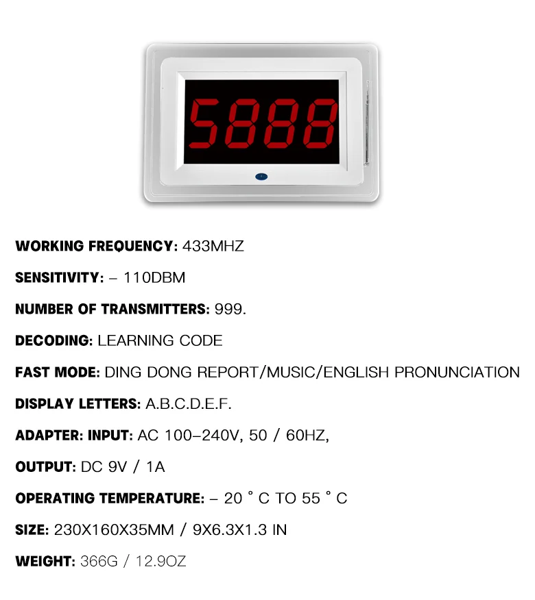 6,99-канальный режим выключение экрана через заданный промежуток времени дисплей 01A/B/C-99A/B/C (банковский перевод), звук ldquoDingdong + No.1-99 callrdquo и показать функция кнопки A/B/C (A: заказ, B: звонок, C: оплата)