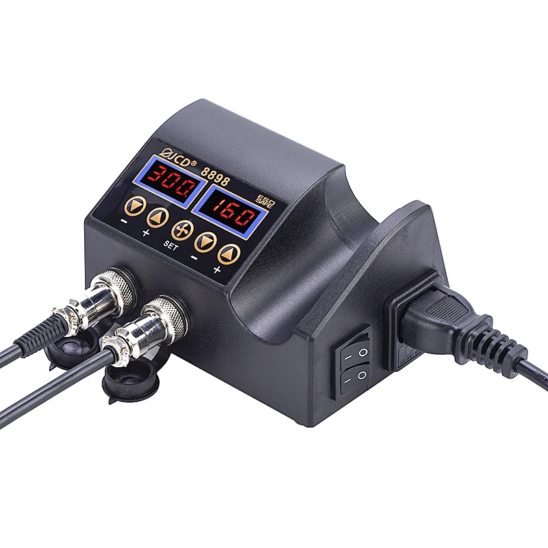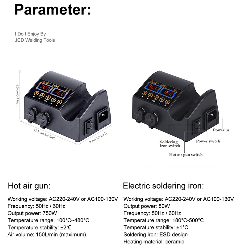 ● Нагреватель горячим воздухом и сварочный Утюг 2 в 1 переделка паяльная станция. ● Двойной ЖК-цифровой дисплей для отображения точной температуры. ● Чрезвычайно низкий уровень шума и компактный дизайн. Интеллектуальная функция самоопределения обеспечивает безопасную личную эксплуатацию. ● Функция автоматического охлаждения для эффективного продления срока службы нагревателя и защиты нагревателя горячим воздухом.