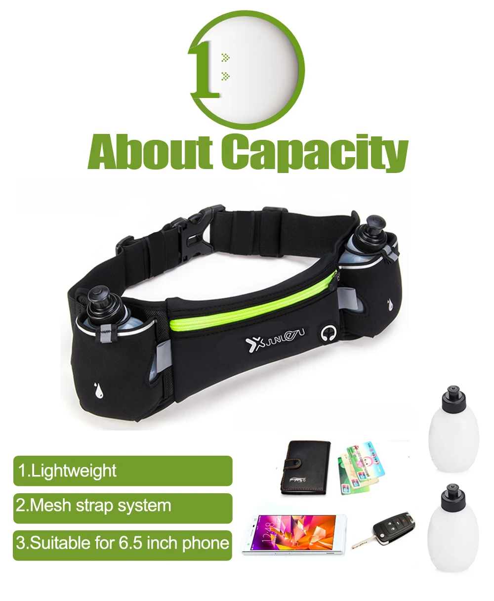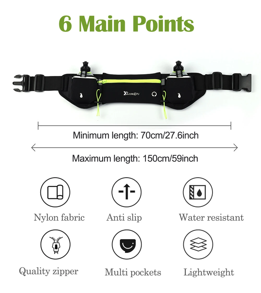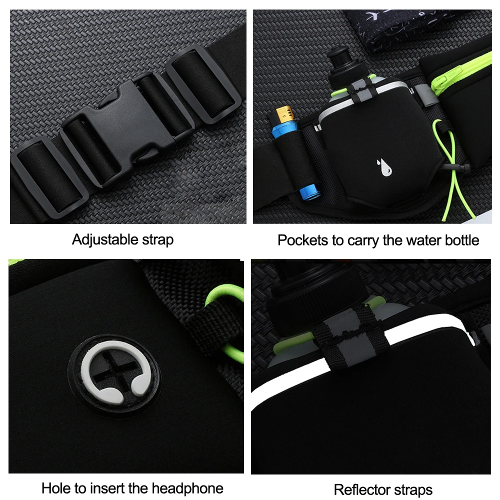 Профессиональный дизайн: 1. Регулируемый ремешок, который удобно облегает талию от 27,6 до 59 дюймов. 2. Есть отверстие для вставки наушников, Наслаждайтесь музыкой во время бега. 3. Два дополнительных кармана для переноски бутылки с водой, а ремешок над карманом может закрепить бутылку с водой. 4. Вы заметны ночью из-за ремней отражателя, напечатанных на ремне.