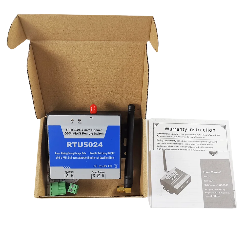 Особенности:* 850/900/1800/1900MHz quad диапазоны, могут работать в глобальных GSM сетях.* Никаких звонков. Реле GSM отвечает на вызов с авторизованного номера, затем выполняет действие включения/выключения на первом 'кольце'.* Безопасное использование идентификатора звонящего для идентификации, неизвестные звонящие игнорируются.* Добавьте или удалите пользователей с помощью sms-команды.* Нет необходимости предоставлять пульт дистанционного управления или ключи для разных пользователей.* До 200 авторизованных телефонных номеров можно настроить в указанное время.* Действие реле вернет подтверждение SMS владельцу или авторизованному номеру вызова, эта функция редактируется пользователем.* Реле закрывается или время открытия программируется.* Несколько приложений. (Ворота, болты, барьеры, гаражные ворота, жалюзи и двери доступа или машины).Характеристики:Модель: RTU5024Частота GSM: 850/900/1800/1900 МГцЦифровой выход: NC/без сухого контакта, 3A/240VACИсточник питания постоянного тока: 9-15VDC/2AМощность Потребляемая мощность: 12V вход Макс. 50мА/средняя 25mASim-карта: Стандартная sim-картаАнтенна: 50Ω SMA Антенный интерфейсДиапазон температур: -20 ~ + 60 °CДиапазон влажности: относительная влажность 90%Размеры: прибл. 3,23*2,99 * 1.06in / 82*76*27 мм