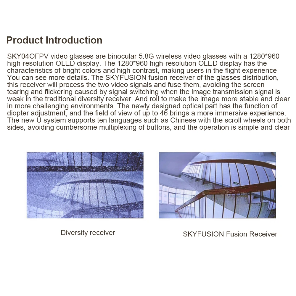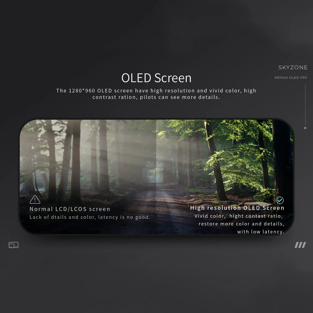 SKY04X является первым goggle skyzone с регулировкой фокуса, экран с высоким разрешением 1280*960 имеет яркий цвет и высокую контрастность, пилот может видеть более подробную информацию в гонках.