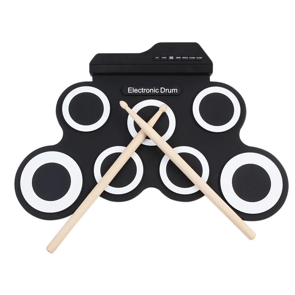 Компактный размер и портативный рулон электронного барабана, очень удобно носить с собой и хранить.С 7 силиконовыми барабанными подушечками, включая Tom/Snare/Hi-Hat/Crash/Ride, что делает отличные звуки и имитирует реальный эффект ударов.Позиции SNARE и HI-HAT можно обменять нажатием специальной кнопки, в соответствии с хитом игрока.Встроенный 5 мелодий барабанного набора, 8 демонстрационных песен и 3 типа ритмов для более легкой практики.Поддерживает usb-порт или 2 * батарейки типа "ААА" источник питания. (аккумуляторы не входят в комплект)С 3,5 мм разъем для наушников для подключения внешних наушники или динамик.С MP3 входом для подключения MP3/смартфона/планшета к воспроизведению сопутствующей музыки.Поставляется в комплекте с парой, барабанные палочки, 2 sustain педали, кабель Type-C, а также 3,5 мм аудио-кабель.Идеально подходит для барабанного набора обучения и практики детей или начинающих, семейных развлечений и сбора друзей.