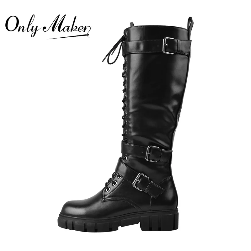 Женские сапоги на плоской подошве Onlymaker, черные матовые сапоги до колена на платформе, с застежкой-молнией и пряжкой