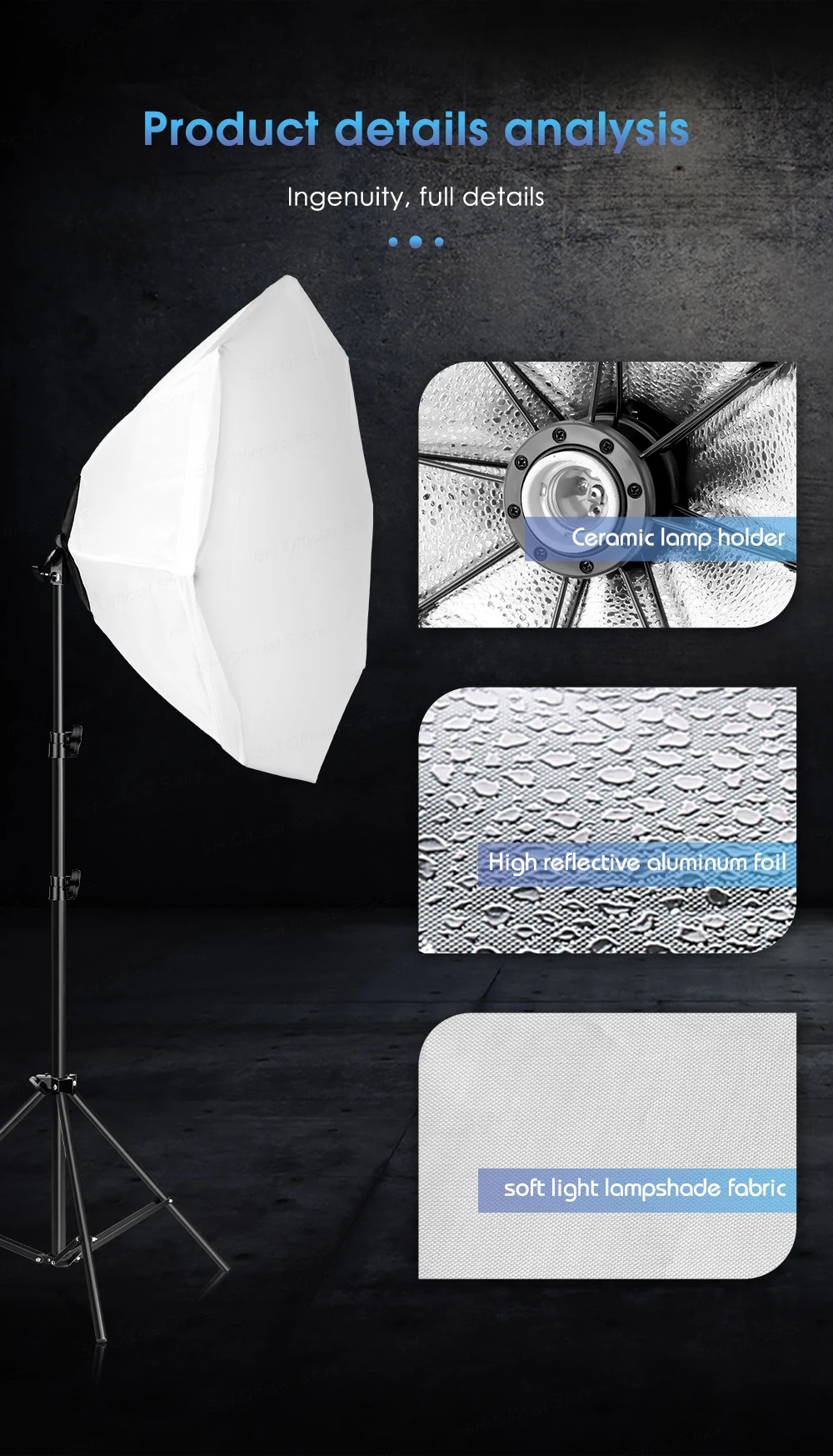 Материал высокого качества: Изготовлен из складного нейлонового покрытия и отличается высокой светоотражающей способностью; Восьмиугольная мягкая ткань, помогает вашей фотографии, смягчая светильник вспышки и отливая даже светильник.Вращающаяся на 240 ° головка и регулируемая подставка: софтбокс для студии имеет независимую фиксирующую ручку, которая может поворачиваться на 240 °, чтобы адаптироваться к различным углам.Светильник изготовлен из высококачественного алюминия. Трехсекционная конструкция колонны может сокращаться до 66 см и растягиваться до 200 см, рабочая высота 190 см.Подходит для различных фотографий: Эта усовершенствованная версия софтбокса очень подходит для использования в студии. Будь то портретная съемка,Модная фотосъемка, детская фотосъемка или натюрморт, эта софтбокс может легко создавать идеальные световые эффекты для внутренней съемки, делая фотографии более привлекательными.Пожизненная гарантия: по любым вопросам, пожалуйста, отправьте нам сообщение. Мы ответим вам в течение 24 часов. Если продукт не удовлетворит вас, вы можете сначала сообщить нам, и мы решим его хорошо для вас.