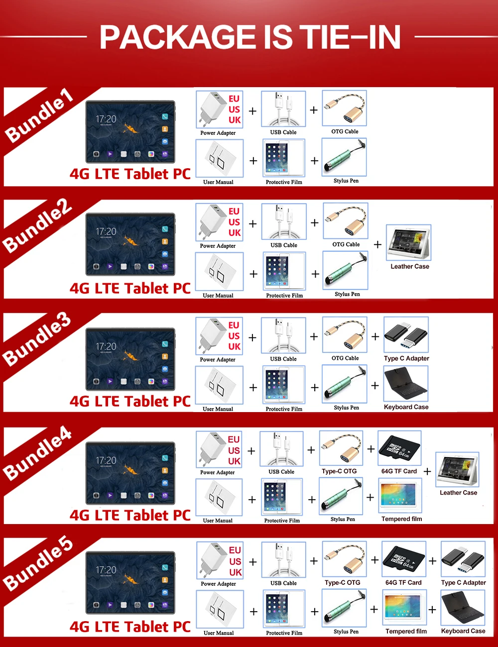 /"4G LTE планшет добавить чехол для клавиатуры плюс" = планшет (10 дюймов Восьмиядерный) + usb кабель + otg кабель + руководство пользователя + подарки+ Чехол для клавиатуры + закаленное стекло + sd-карта 64 ГБ