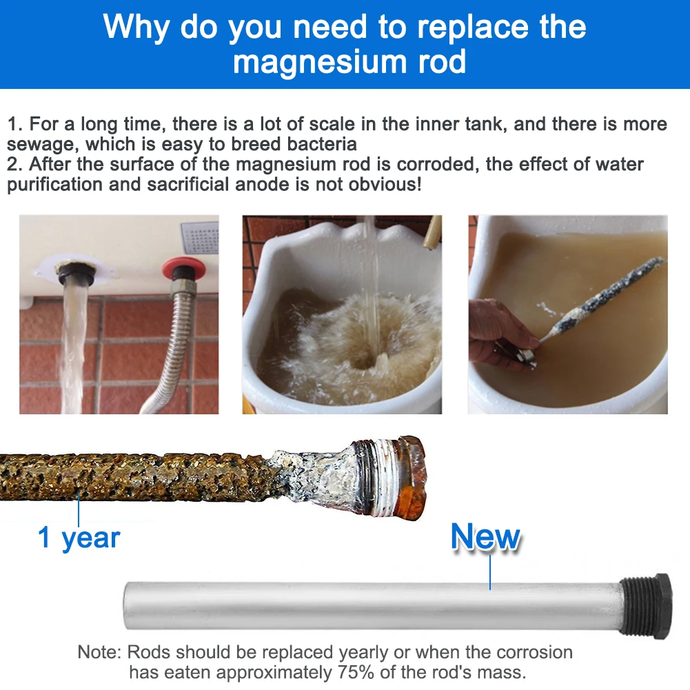 Описание: Безопасность на первом месте: анодные стержни водонагревателя RV изготовлены из прочного магния, который гарантированно выдержит испытание временем. Совместимость: эти магниевые анодные стержни имеют длину 9,25 дюйма, поставляются с резьбой дюйма NPT и совместимы с пригородными резервуарами для воды Mor-Flo. Более длительный срок службы: Эти магниевые анодные стержни водонагревателя работают лучше, чем алюминиевые, привлекая агрессивные элементы, защищая ваш водонагреватель и продлевая его жизнь. Использование: для фиксации резервуара водонагревателя и оптимизации его функциональности. Размер гнезда: для стержней используется гнездо 1-1/16 дюйма. Спецификация: Материал: магний Тип: A, B Цвет: анодный стержень: черный + серебристый Размер (приблизительно): NPT3/4*21*238 мм/NPT3/4*0,82 (D)* 9,25 дюйма (L) Посылка: Тип А: 1 шт. х анодный стержень Тип B: 1 шт. х анодный стержень Розетка-1 шт. Примечание: 1. Из-за разницы в освещении и экранах цвет изделия может немного отличаться от изображения. 2. Возможны отклонения в 1-2 см из-за ручного измерения.
