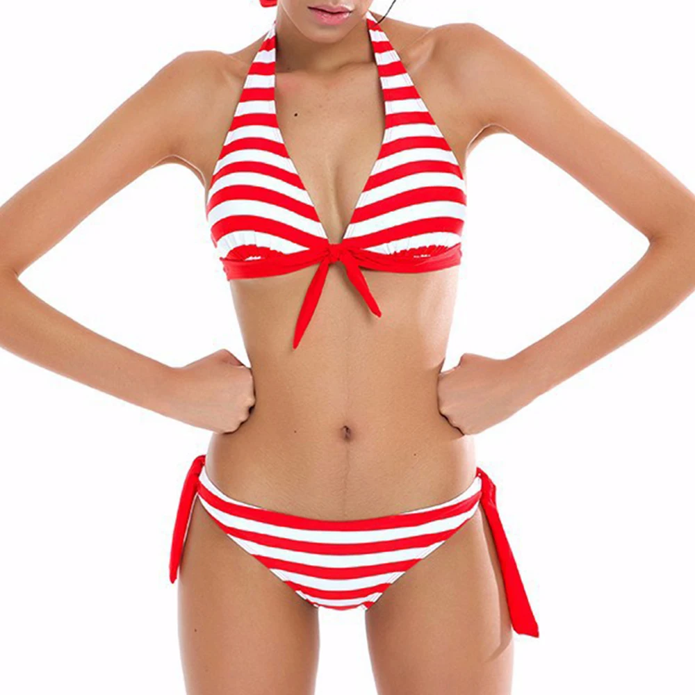 Сексуальное бикини с лямкой на шее, новинка 2021, женский купальник, Женский комплект бикини в полоску с принтом, купальные костюмы, летняя пляжная одежда для плавания