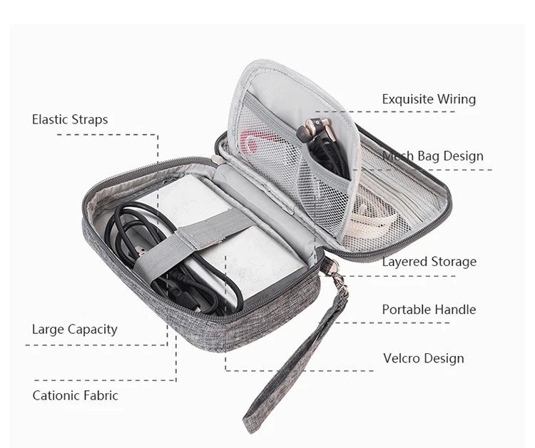 Портативный, практичный, водонепроницаемый и прочный;Большая емкость, внешний аккумулятор для хранения, мобильный телефон, гарнитура, кабель для передачи данных и т. д.;Изоляционная конструкция сетчатого мешка, предотвращает запутывание, обеспечивает высокое использование пространства;Изысканный внешний вид, большая емкость внутри, удобно носить с собой.