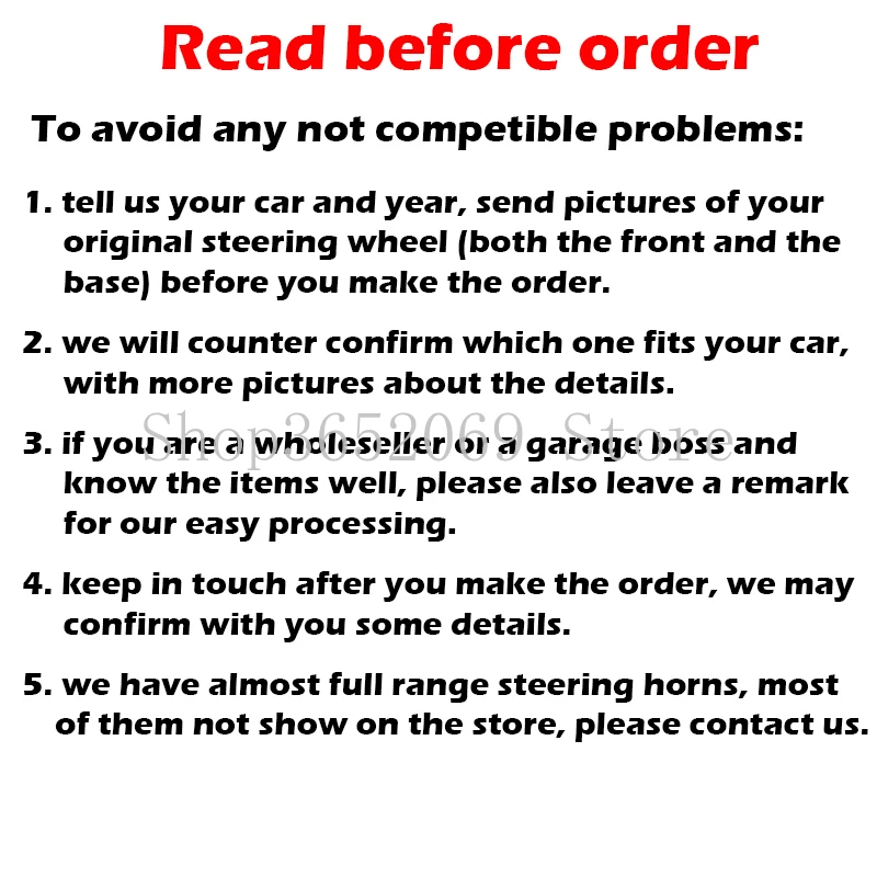 1. Сообщите нам ваш автомобиль и год, отправьте фотографии вашего оригинального руля (как переднего, так и базового), прежде чем сделать заказ.